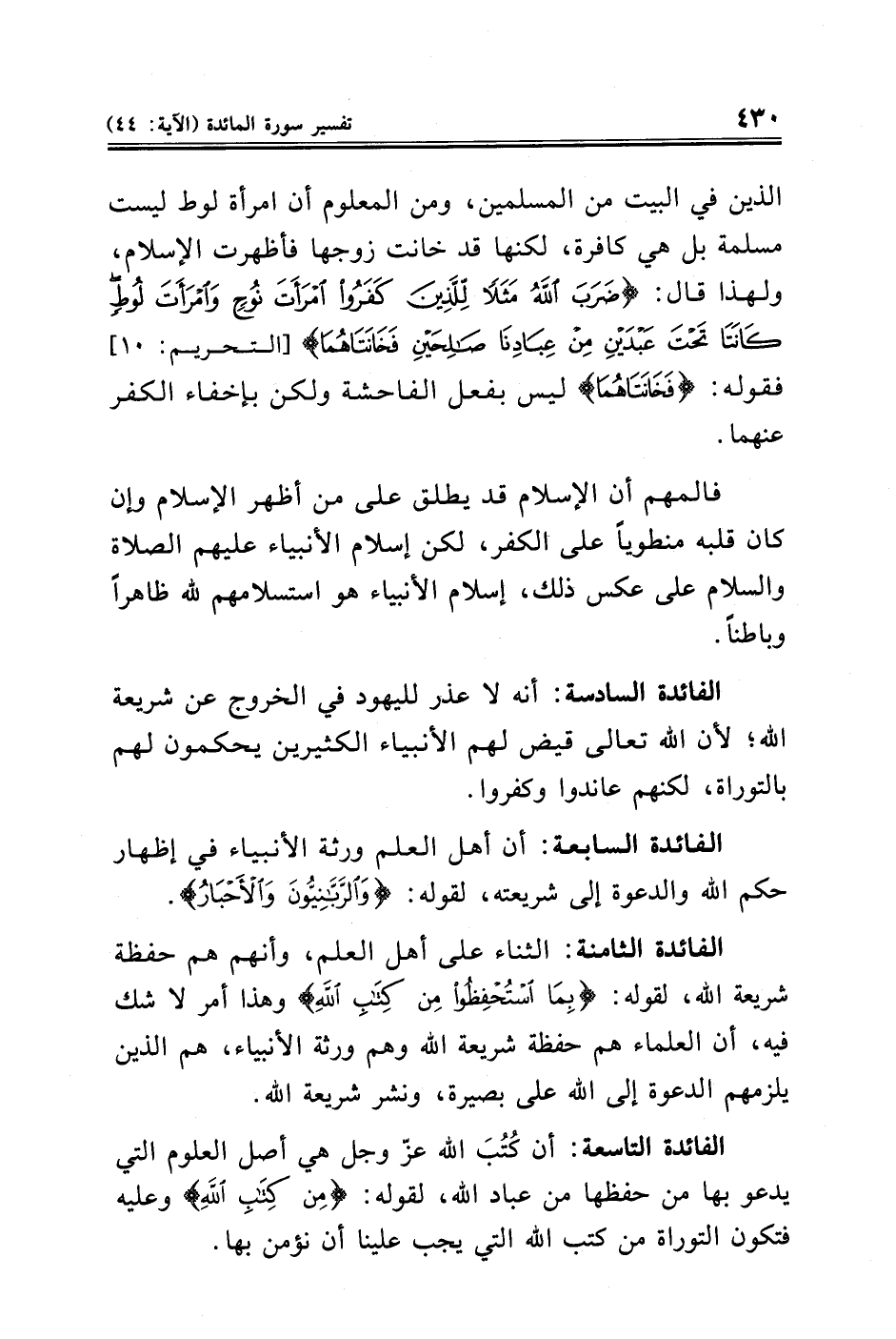 الفائدة السادسة: أنه لا عذر لليهود في الخروج عن شريعة الله؛ لأن الله تعالى قيض لهم الأنبياء الكثيرين يحكمون لهم بالتوراة، لكنهم عاندوا وكفروا.
