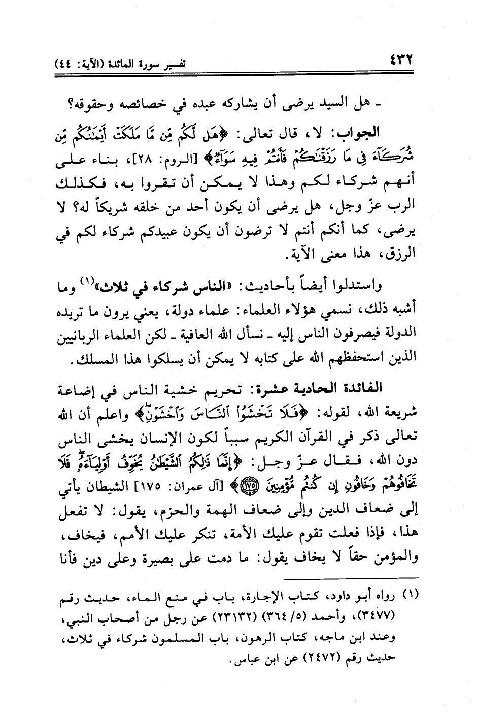الفائدة الحادية عشرة: تحريم خشية الناس في إضاعة شريعة الله، لقوله: {فَلَا تَخْشَوُا النَّاسَ وَاخْشَوْنِ} واعلم أن الله تعالى ذكر في القرآن الكريم سببًا لكون الإنسان يخشى الناس دون الله، فقال عزّ وجل: {إِنَّمَا ذَلِكُمُ الشَّيْطَانُ يُخَوِّفُ أَوْلِيَاءَهُ فَلَا تَخَافُوهُمْ وَخَافُونِ إِنْ كُنْتُمْ مُؤْمِنِينَ (١٧٥)} [آل عمران: ١٧٥] الشيطان يأتي إلى ضعاف الدين وإلى ضعاف الهمة والحزم، يقول: لا تفعل هذا، فإذا فعلت تقوم عليك الأمة، تنكر عليك الأمم، فيخاف، والمؤمن حقًّا لا يخاف يقول: ما دمت على بصيرة وعلى دين فأنا