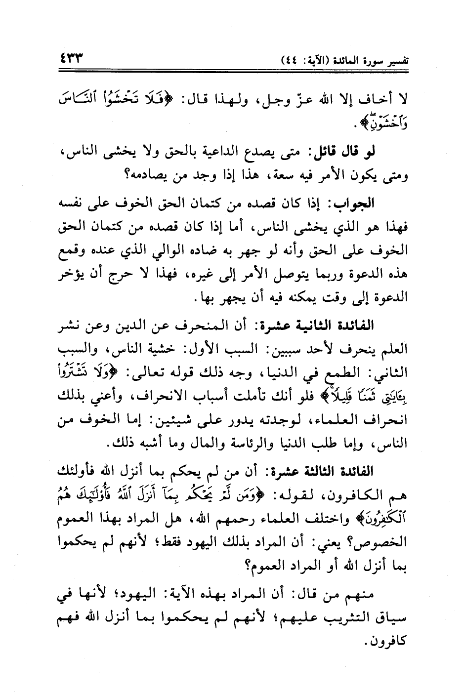 الفائدة الثالثة عشرة: أن من لم يحكم بما أنزل الله فاولئك هم الكافرون، لقوله: {وَمَنْ لَمْ يَحْكُمْ بِمَا أَنْزَلَ اللَّهُ فَأُولَئِكَ هُمُ الْكَافِرُونَ} [المائدة: ٤٤] واختلف العلماء رحمهم الله، هل المراد بهذا العموم الخصوص؟ يعني: أن المراد بذلك اليهود فقط؛ لأنهم لم يحكموا بما أنزل الله أو المراد العموم؟