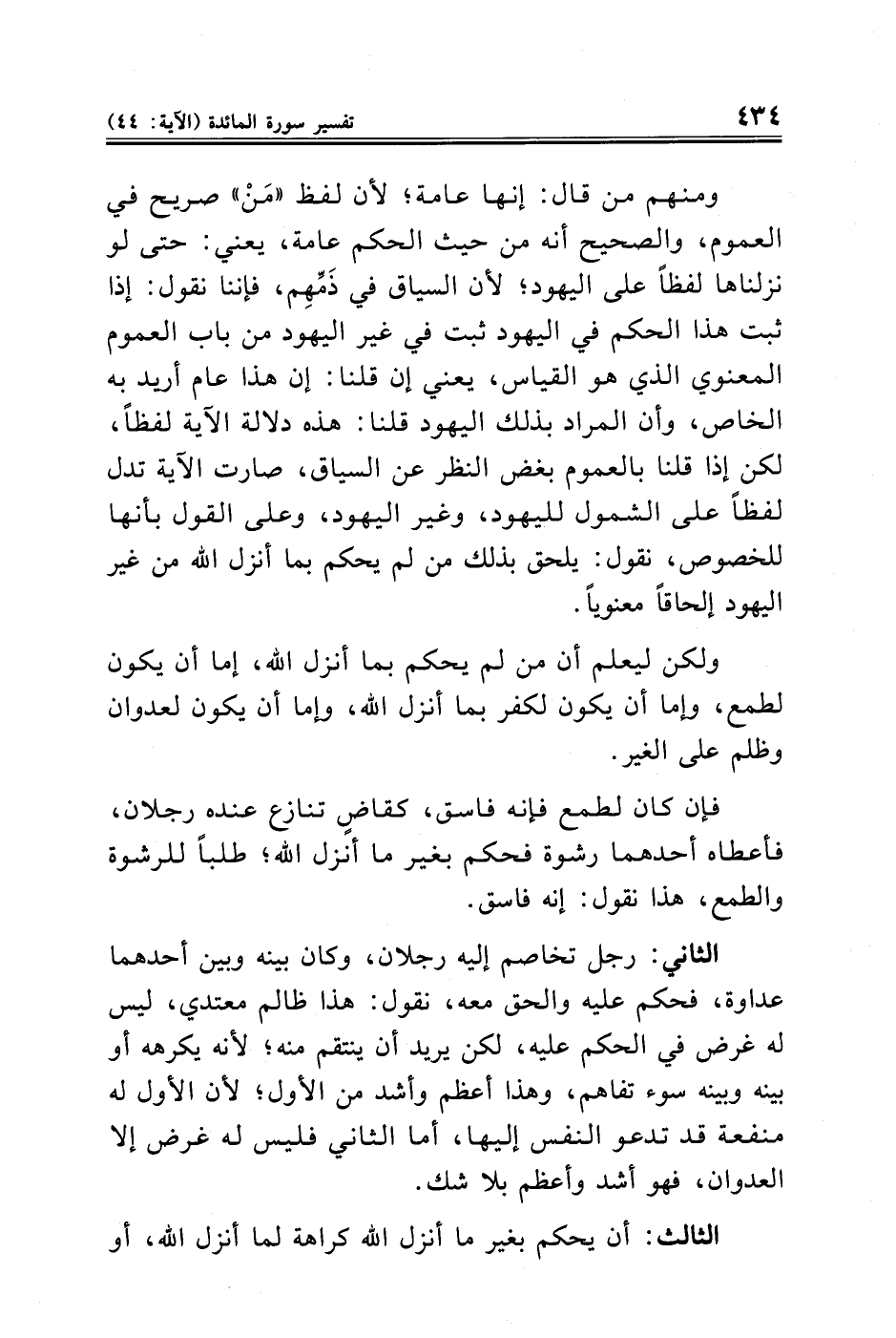 ولكن ليعلم أن من لم يحكم بما أنزل الله، إما أن يكون لطمع، وإما أن يكون لكفر بما أنزل الله، وإما أن يكون لعدوان وظلم على الغير.
