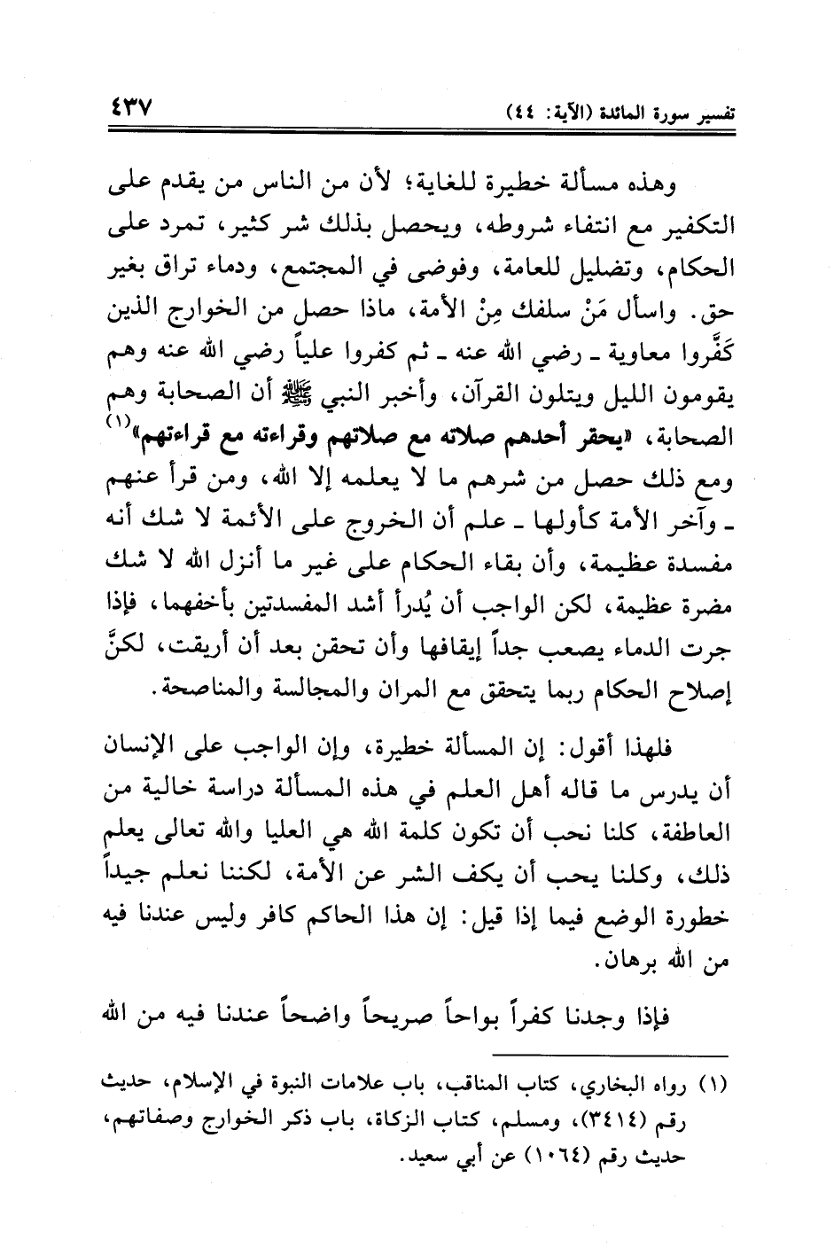وهذه مسألة خطيرة للغاية؛ لأن من الناس من يقدم على المكفير مع انتفاء شروطه، ويحصل بذلك شر كثير، تمرد على الحكام، وتضليل للعامة، وفوضى في المجتمع، ودماء تراق بغير حق. واسأل مَنْ سلفك مِنْ الأمة، ماذا حصل من الخوارج الذين كَفَروا معاوية -رضي الله عنه- ثم كفروا عليًّا رضي الله عنه وهم يقومون الليل ويتلون القرآن، وأخبر النبي - صلى الله عليه وسلم - أن الصحابة وهم الصحابة، "يحقر أحدهم صلاته مع صلاتهم وقراءته مع قراءتهم" (¬١) ومع ذلك حصل من شرهم ما لا يعلمه إلا الله، ومن قرأ عنهم -وآخر الأمة كأولها- علم أن الخروج على الأئمة لا شك أنه مفسدة عظيمة، وأن بقاء الحكام على غير ما أنزل الله لا شك مضرة عظيمة، لكن الواجب أن يُدرأ أشد المفسدتين بأخفهما، فإذا جرت الدماء يصعب جدًّا إيقافها وأن تحقن بعد أن أريقت، لكنَّ إصلاح الحكام ربما يتحقق مع المران والمجالسة والمناصحة.