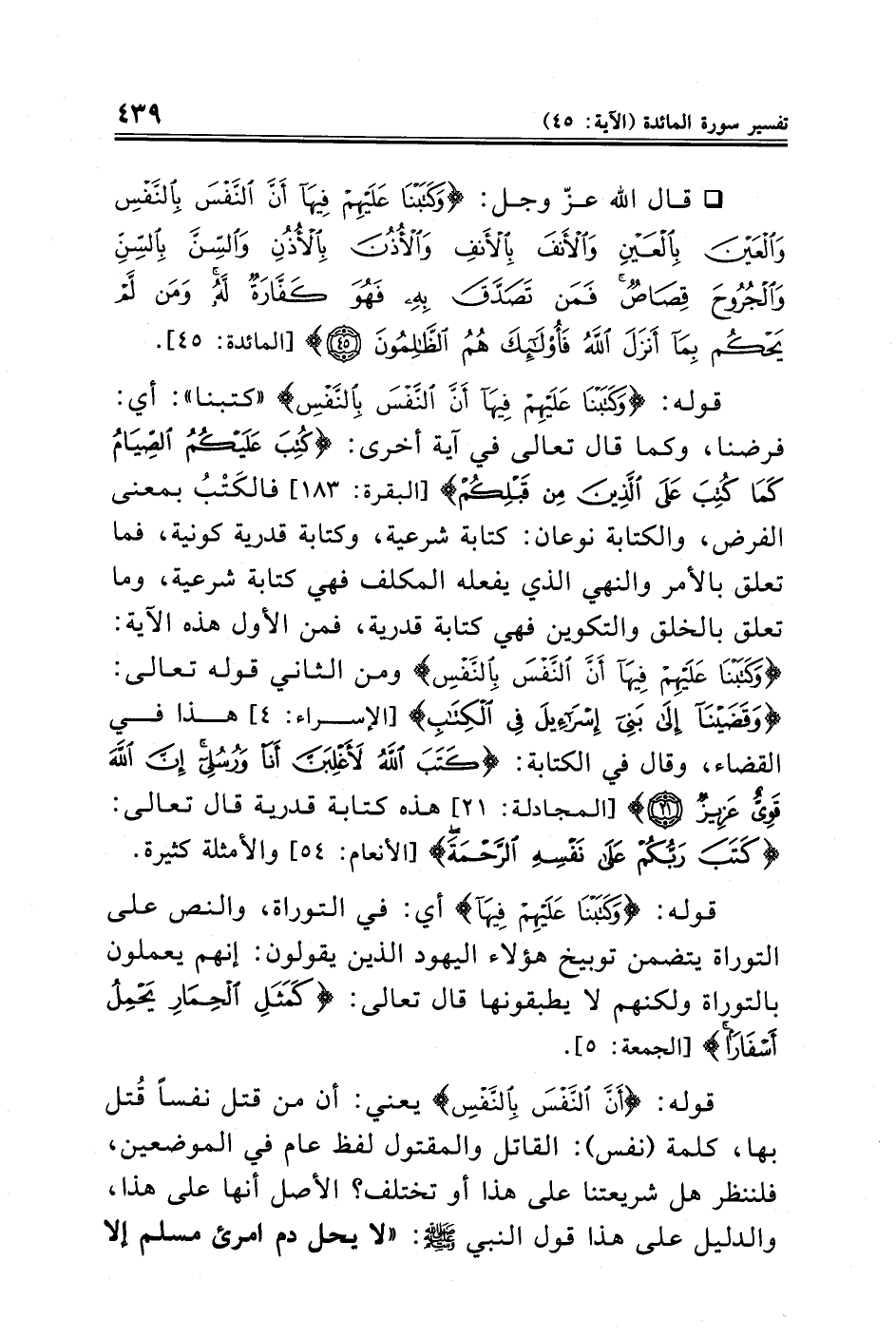 قوله: {وَكَتَبْنَا عَلَيْهِمْ فِيهَا أَنَّ النَّفْسَ بِالنَّفْسِ} "كتبنا": أي: فرضنا، وكما قال تعالى في آية أخرى: {كُتِبَ عَلَيْكُمُ الصِّيَامُ كَمَا كُتِبَ عَلَى الَّذِينَ مِنْ قَبْلِكُمْ} [البقرة: ١٨٣] فالكَتْبُ بمعنى الفرض، والكتابة نوعان: كتابة شرعية، وكتابة قدرية كونية، فما تعلق بالأمر والنهي الذي يفعله المكلف فهي كتابة شرعية، وما تعلق بالخلق والتكوين فهي كتابة قدرية، فمن الأول هذه الآية: {وَكَتَبْنَا عَلَيْهِمْ فِيهَا أَنَّ النَّفْسَ بِالنَّفْسِ} ومن الثاني قوله تعالى: {وَقَضَيْنَا إِلَى بَنِي إِسْرَائِيلَ فِي الْكِتَابِ} [الإسراء: ٤] هذا في القضاء، وقال في الكتابة: {كَتَبَ اللَّهُ لَأَغْلِبَنَّ أَنَا وَرُسُلِي إِنَّ اللَّهَ قَوِيٌّ عَزِيزٌ (٢١)} [المجادلة: ٢١] هذه كتابة قدرية قال تعالى: {كَتَبَ رَبُّكُمْ عَلَى نَفْسِهِ الرَّحْمَةَ} [الأنعام: ٥٤] والأمثلة كثيرة.