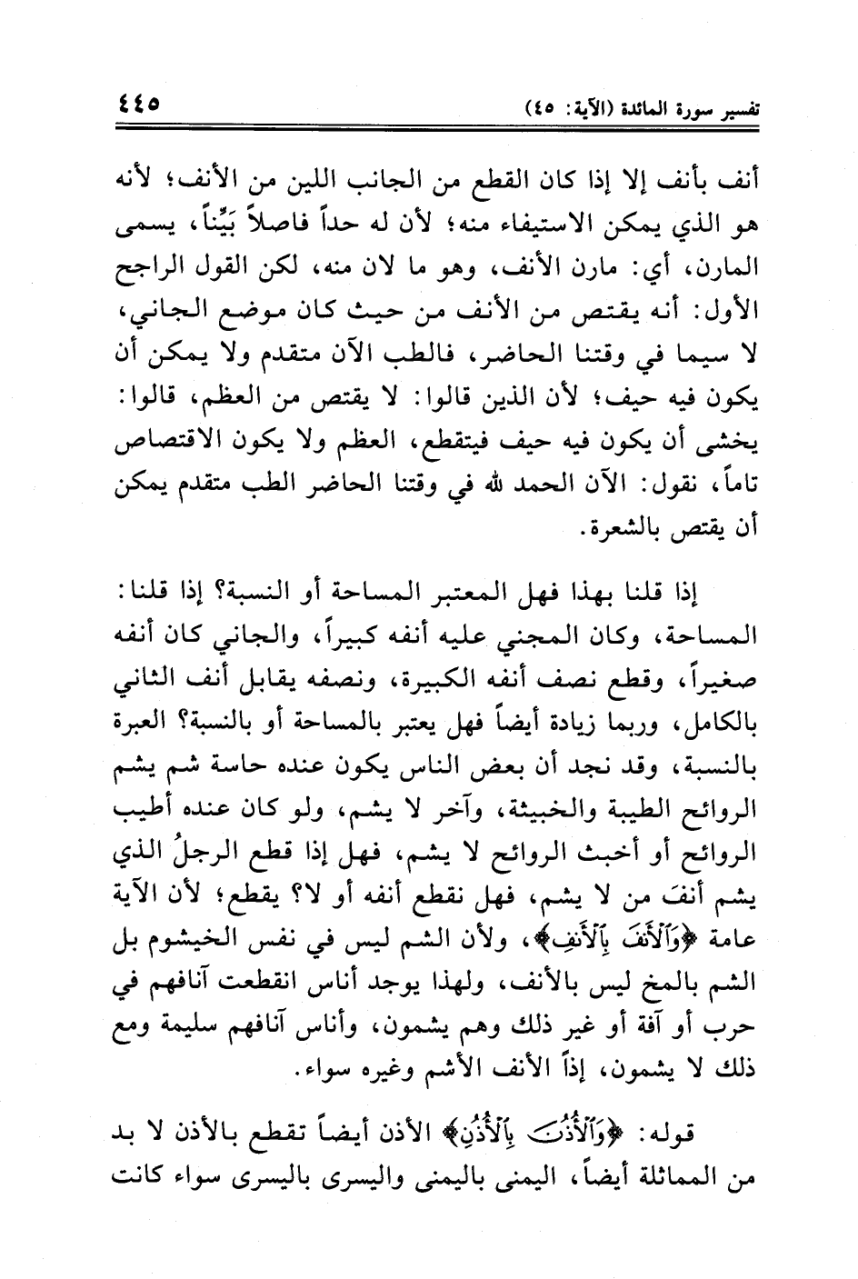 إذا قلنا بهذا فهل المعتبر المساحة أو النسبة؟ إذا قلنا: المساحة، وكان المجني عليه أنفه كبيرًا، والجاني كان أنفه صغيرًا، وقطع نصف أنفه الكبيرة، ونصفه يقابل أنف الثاني بالكامل، وربما زيادة أيضًا فهل يعتبر بالمساحة أو بالنسبة؟ العبرة بالنسبة، وقد نجد أن بعض الناس يكون عنده حاسة شم يشم الروائح الطيبة والخبيثة، وآخر لا يشم، ولو كان عنده أطيب الروائح أو أخبث الروائح لا يشم، فهل إذا قطع الرجلُ الذي يشم أنفَ من لا يشم، فهل نقطع أنفه أو لا؟ يقطع؛ لأن الآية عامة {وَالْأَنْفَ بِالْأَنْفِ}، ولأن الشم ليس في نفس الخيشوم بل الشم بالمخ ليس بالأنف، ولهذا يوجد أناس انقطعت آنافهم في حرب أو آفة أو غير ذلك وهم يشمون، وأناس آنافهم سليمة ومع ذلك لا يشمون، إذًا الأنف الأشم وغيره سواء.