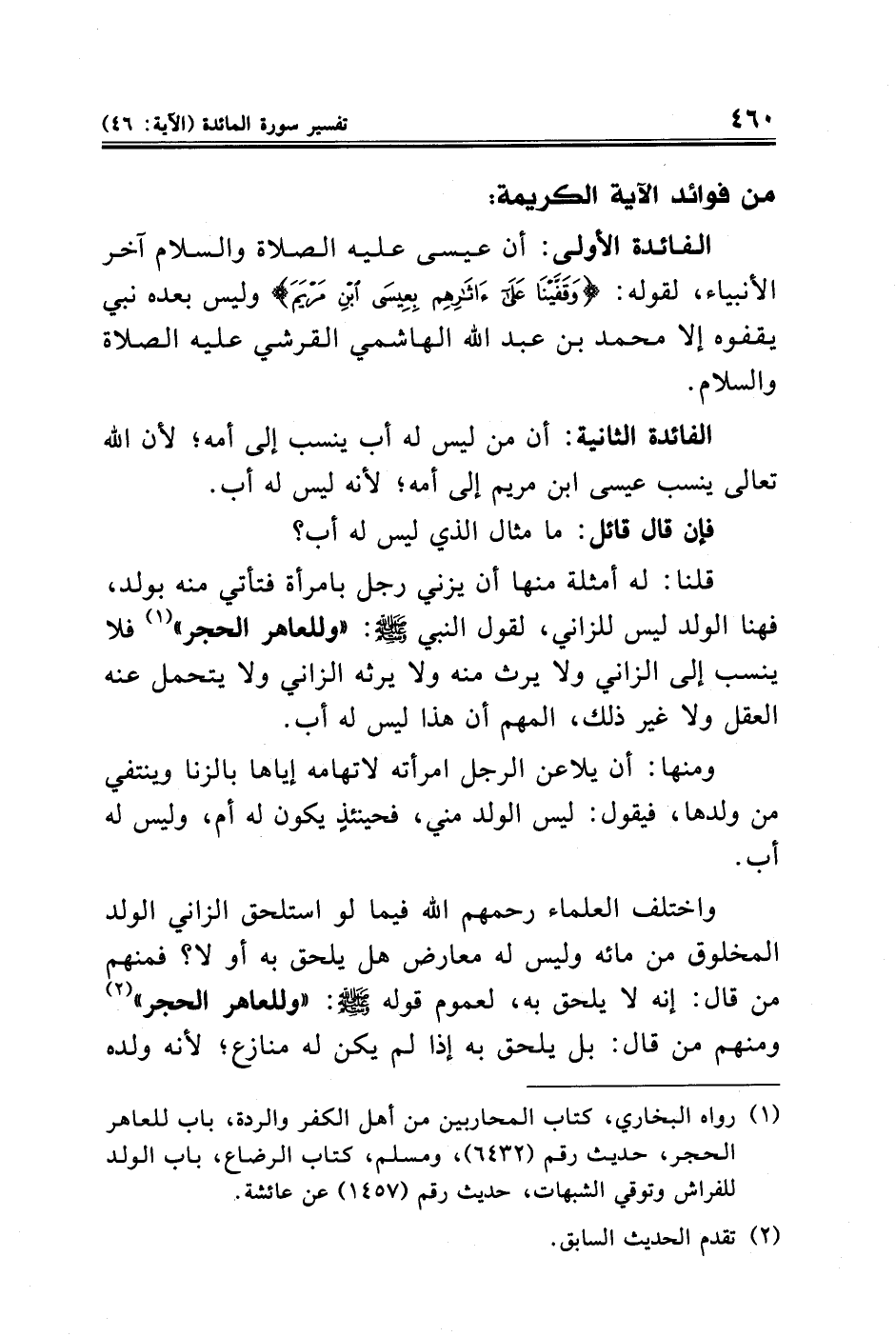 (¬١) رواه البخاري، كتاب المحاربين من أهل الكفر والردة، باب للعاهر الحجر، حديث رقم (٦٤٣٢)، ومسلم، كتاب الرضاع، باب الولد للفراش وتوقي الشبهات، حديث رقم (١٤٥٧) عن عائشة.