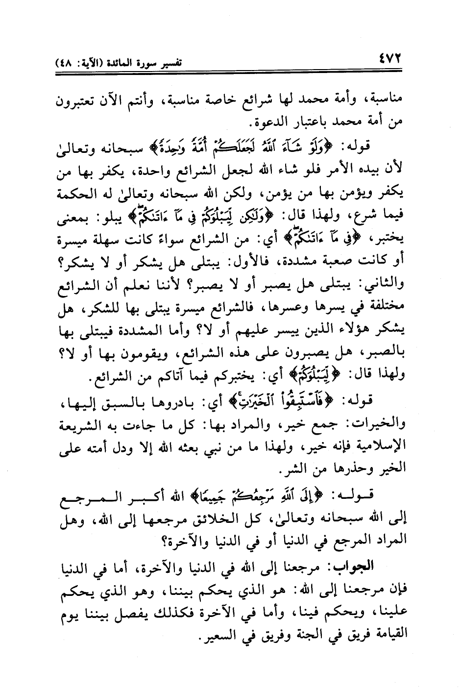قوله: {وَلَوْ شَاءَ اللَّهُ لَجَعَلَكُمْ أُمَّةً وَاحِدَةً} سبحانه وتعالى لأن بيده الأمر فلو شاء الله لجعل الشرائع واحدة، يكفر بها من يكفر ويؤمن بها من يؤمن، ولكن الله سبحانه وتعالى له الحكمة فيما شرع، ولهذا قال: {وَلَكِنْ لِيَبْلُوَكُمْ فِي مَا آتَاكُمْ} يبلو: بمعنى يختبر، {فِي مَا آتَاكُمْ} أي: من الشرائع سواءً كانت سهلة ميسرة أو كانت صعبة مشددة، فالأول: يبتلى هل يشكر أو لا يشكر؟ والثاني: يبتلى هل يصبر أو لا يصبر؟ لأننا نعلم أن الشرائع مختلفة في يسرها وعسرها، فالشرائع ميسرة يبتلى بها للشكر، هل يشكر هؤلاء الذين ييسر عليهم أو لا؟ وأما المشددة فيبتلى بها بالصبر، هل يصبرون على هذه الشرائع، ويقومون بها أو لا؟ ولهذا قال: {لِيَبْلُوَكُمْ} أي: يختبركم فيما آتاكم من الشرائع.