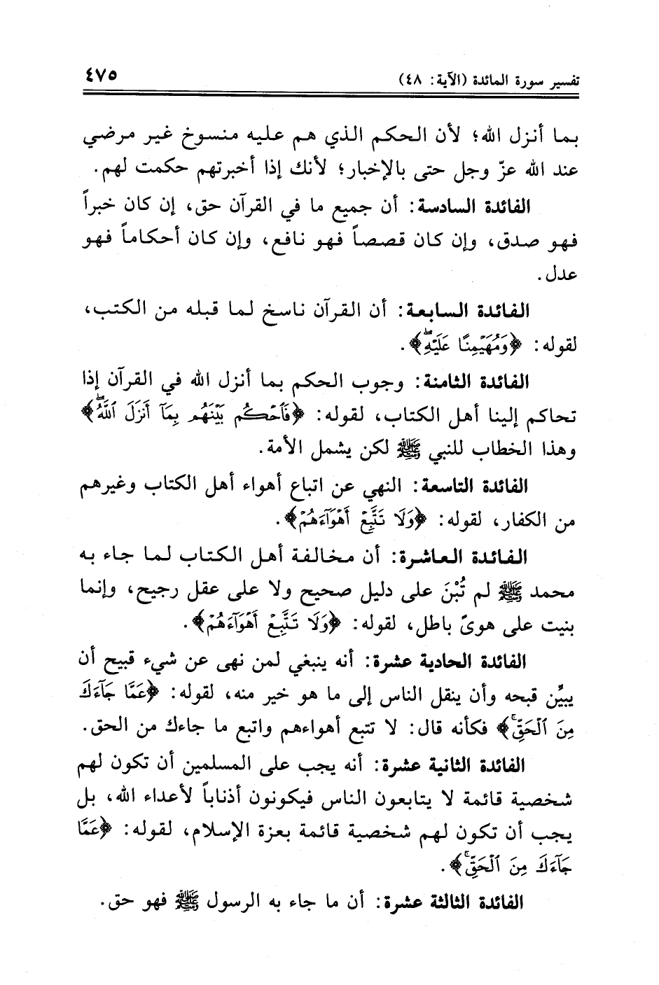 الفائدة الثامنة: وجوب الحكم بما أنزل الله في القرآن إذا تحاكم إلينا أهل الكتاب، لقوله: {فَاحْكُمْ بَيْنَهُمْ بِمَا أَنْزَلَ اللَّهُ} وهذا الخطاب للنبي -صلى الله عليه وسلم- لكن يشمل الأمة.