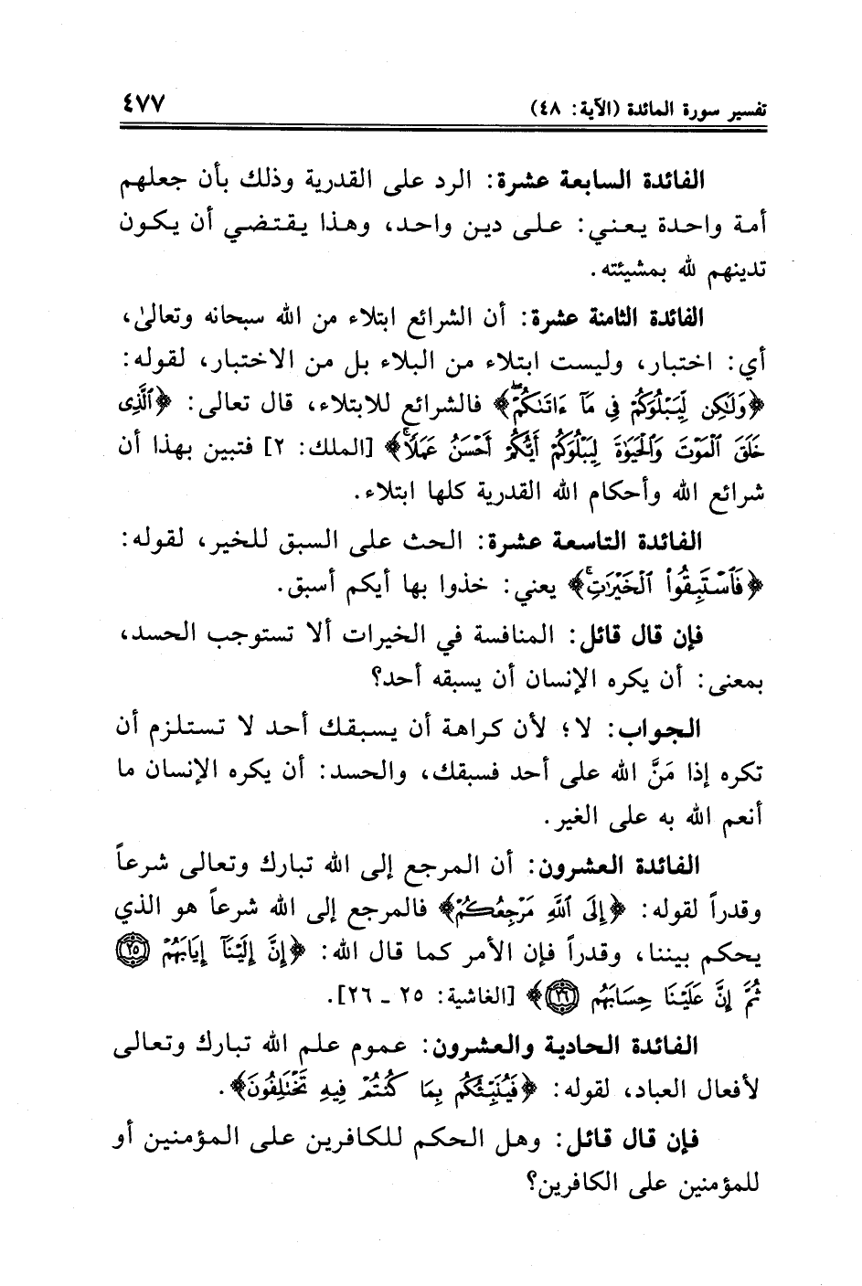 الفائدة الثامنة عشرة: أن الشراع ابتلاء من الله سبحانه وتعالى، أي: اختبار، وليست ابتلاء من البلاء بل من الاختبار، لقوله: {وَلَكِنْ لِيَبْلُوَكُمْ فِي مَا آتَاكُمْ} فالشرائع للابتلاء، قال تعالى {الَّذِي خَلَقَ الْمَوْتَ وَالْحَيَاةَ لِيَبْلُوَكُمْ أَيُّكُمْ أَحْسَنُ عَمَلًا} [الملك: ٢] فتبين بهذا أن شرائع الله وأحكام الله القدرية كلها ابتلاء.