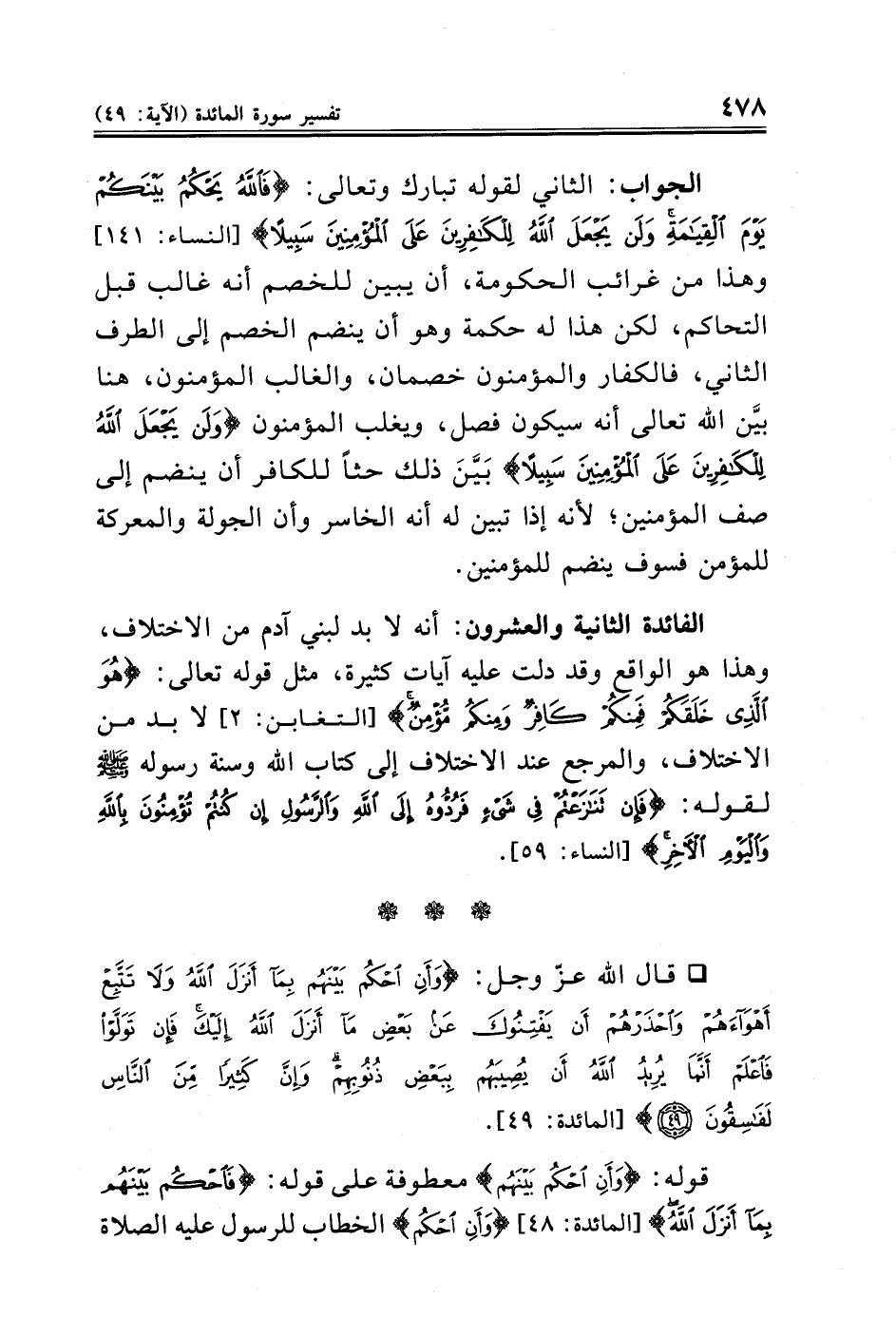 الفائدة الثانية والعشرون: أنه لا بد لبني آدم من الاختلاف، وهذا هو الواقع وقد دلت عليه آيات كثيرة، مثل قوله تعالى: {هُوَ الَّذِي خَلَقَكُمْ فَمِنْكُمْ كَافِرٌ وَمِنْكُمْ مُؤْمِنٌ} [التغابن: ٢]، لا بد من الاختلاف، والمرجع عند الاختلاف إلى كتاب الله وسنة رسوله -صلى الله عليه وسلم- لقوله: {فَإِنْ تَنَازَعْتُمْ فِي شَيْءٍ فَرُدُّوهُ إِلَى اللَّهِ وَالرَّسُولِ إِنْ كُنْتُمْ تُؤْمِنُونَ بِاللَّهِ وَالْيَوْمِ الْآخِرِ} [النساء: ٥٩].