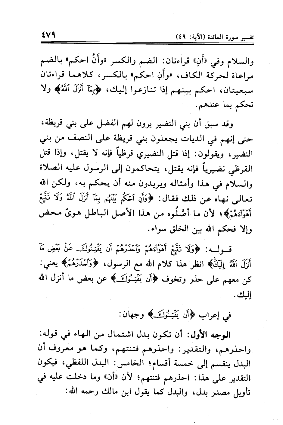 الوجه الأول: أن تكون بدل اشتمال من الهاء في قوله: واحذرهم، والتقدير: واحذرهم فتنتهم، وكما هو معروف أن البدل ينقسم إلى خمسة أقسام؛ الخامس: البدل اللفظي، فيكون التقدير على هذا: احذرهم فتنتهم؛ لأن "أن" وما دخلت عليه في تأويل مصدر بدل، والبدل كما يقول ابن مالك رحمه الله:
