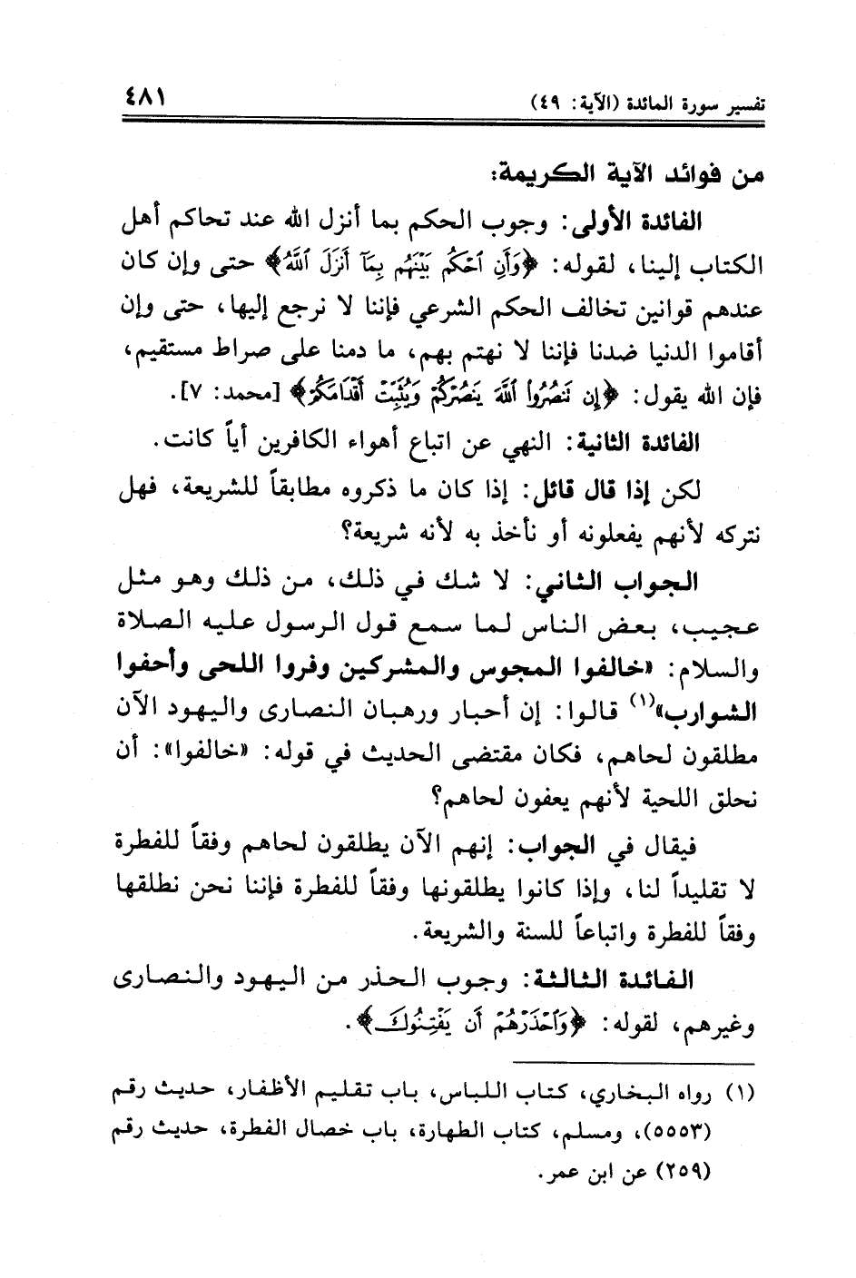 الفائدة الأولى: وجوب الحكم بما أنزل الله عند تحاكم أهل الكتاب إلينا، لقوله: {وَأَنِ احْكُمْ بَيْنَهُمْ بِمَا أَنْزَلَ اللَّهُ} حتى وإن كان عندهم قوانين تخالف الحكم الشرعي فإننا لا نرجع إليها، حتى وإن أقاموا الدنيا ضدنا فإننا لا نهتم بهم، ما دمنا على صراط مستقيم، فإن الله يقول: {إِنْ تَنْصُرُوا اللَّهَ يَنْصُرْكُمْ وَيُثَبِّتْ أَقْدَامَكُمْ} [محمد: ٧].