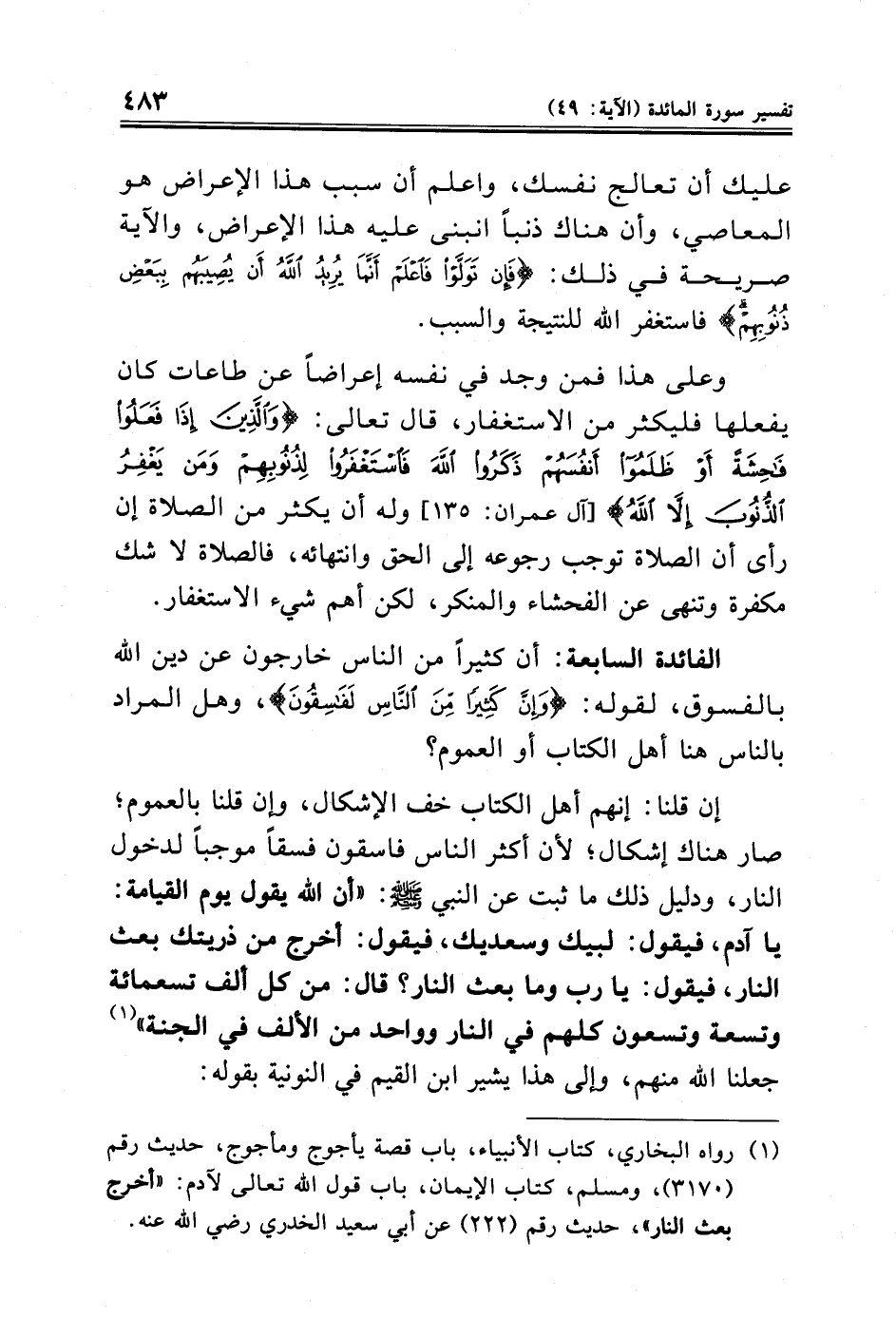 إن قلنا: إنهم أهل الكتاب خف الإشكال، وإن قلنا بالعموم؛ صار هناك إشكال؛ لأن أكثر الناس فاسقون فسقًا موجبًا لدخول النار، ودليل ذلك ما ثبت عن النبي -صلي الله عليه وسلم-: "أن الله يقول يوم القيامة: يا آدم، فيقول: لبيك وسعديك، فيقول: أخرج من ذريتك بعث النار، فيقول: يا رب وما بعث النار؟ قال: من كل ألف تسعمائة وتسعة وتسعون كلهم في النار وواحد من الألف في الجنة" (¬١) جعلنا الله منهم، وإلى هذا يشير ابن القيم في النونية بقوله: