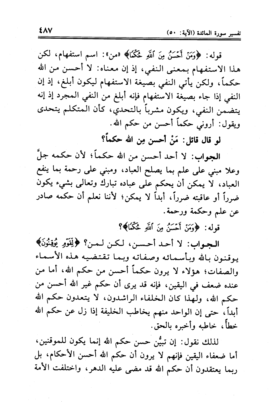 قوله: {وَمَنْ أَحْسَنُ مِنَ اللَّهِ حُكْمًا} "من": اسم استفهام، لكن هذا الاستفهام بمعنى النفي، إذ إن معناه: لا أحسن من الله حكمًا، ولكن يأتي النفي بصيغة الاستفهام ليكون أبلغ، إذ إن النفي إذا جاء بصيغة الاستفهام فإنه أبلغ من النفي المجرد إذ إنه يتضمن النفي، ويكون مشربًا بالتحدي، كأن المتكلم يتحدى ويقول: أروني حكمًا أحسن من حكم الله.