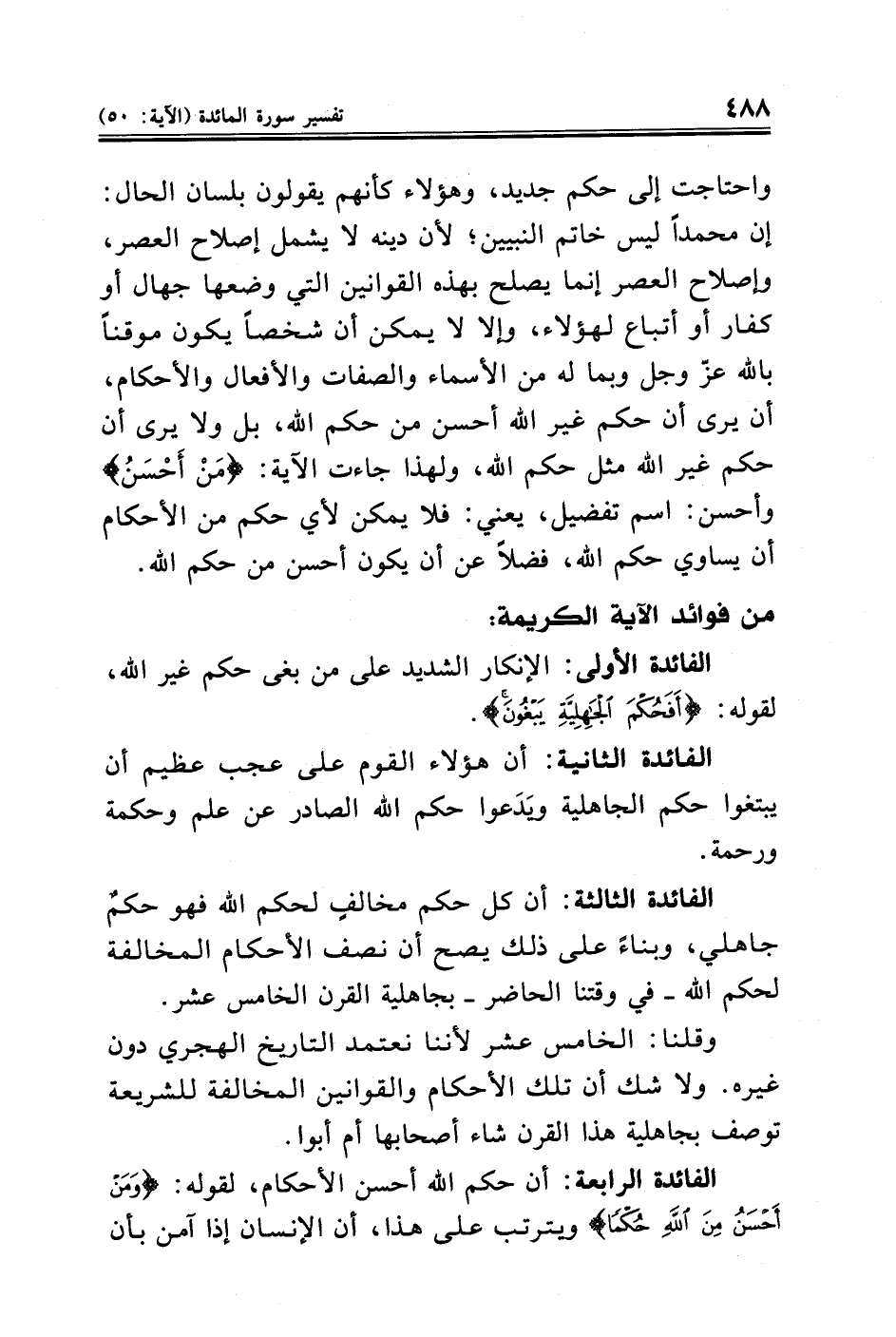 الفائدة الثالثة: أن كل حكم مخالفٍ لحكم الله فهو حكم جاهلي، وبناءً على ذلك يصح أن نصف الأحكام المخالفة لحكم الله -في وقتنا الحاضر- بجاهلية القرن الخامس عشر.