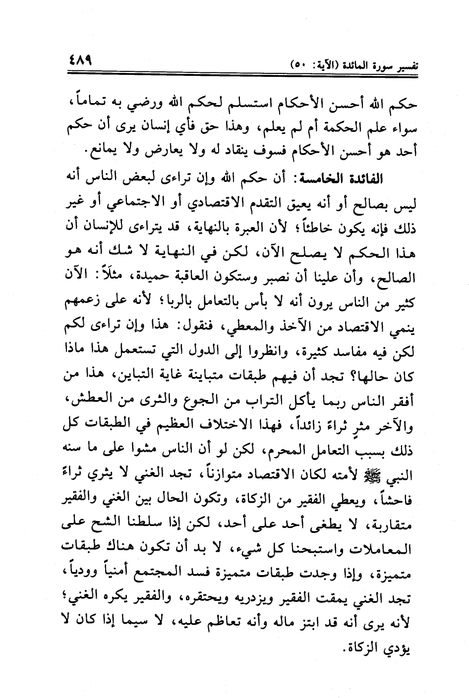 الفائدة الخامسة: أن حكم الله وإن تراءى لبعض الناس أنه ليس بصالح أو أنه يعيق التقدم الاقتصادي أو الاجتماعي أو غير ذلك فإنه يكون خاطئًا؛ لأن العبرة بالنهاية، قد يتراءى للإنسان أن هذا الحكم لا يصلح الآن، لكن في النهاية لا شك أنه هو الصالح، وأن علينا أن نصبر وستكون العاقبة حميدة، مثلًا: الآن كثير من الناس يرون أنه لا بأس بالتعامل بالربا؛ لأنه على زعمهم ينمي الاقتصاد من الآخذ والمعطي، فنقول: هذا وإن تراءى لكم لكن فيه مفاسد كثيرة، وانظروا إلى الدول التي تستعمل هذا ماذا كان حالها؟ تجد أن فيهم طبقات متباينة غاية التباين، هذا من أفقر الناس ربما يأكل التراب من الجوع والثرى من العطش، والآخر مثرٍ ثراءً زائدًا، فهذا الاختلاف العظيم في الطبقات كل ذلك بسبب التعامل المحرم، لكن لو أن الناس مشوا على ما سنه النبي -صلي الله عليه وسلم- لأمته لكان الاقتصاد متوازنًا، تجد الغني لا يثري ثراءً فاحشًا، ويعطي الفقير من الزكاة، وتكون الحال بين الغني والفقير متقاربة، لا يطغى أحد على أحد، لكن إذا سلطنا الشح على المعاملات واستبحنا كل شيء، لا بد أن تكون هناك طبقات متميزة، وإذا وجدت طبقات متميزة فسد المجتمع أمنيًا ووديًا، تجد الغني يمقت الفقير ويزدريه ويحتقره، والفقير يكره الغني؛ لأنه يرى أنه قد ابتز ماله وأنه تعاظم عليه، لا سيما إذا كان لا يؤدي الزكاة.