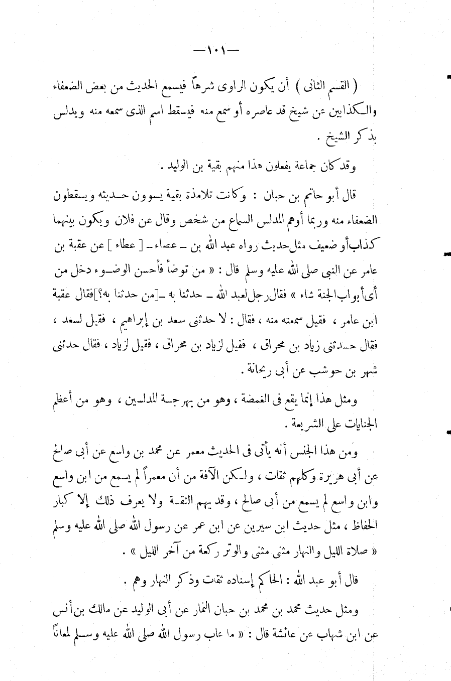 قَالَ أَبُو حَاتِم بن حبَان: وَكَانَت تلامذة بَقِيَّة يسوون حَدِيثه ويسقطون الضُّعَفَاء مِنْهُ وَرُبمَا أوهم المدلس السماع من شخص وَقَالَ عَن فَلِأَن وَيكون بَينهمَا كَذَّاب أَو ضَعِيف مثل حَدِيث رَوَاهُ عبد الله بن م صاء [عَطاء] عَن عقبَة بن عَامر م ن النَّبِي صَلَّى اللَّهُ عَلَيْهِ وَسَلَّمَ قَالَ: " من تَوَضَّأ فَأحْسن الْوضُوء دخل من أَي أَبْوَاب الْجنَّة شَاءَ " فَقَالَ رجل لعبد الله حَدثنَا بِهِ من حَدثنَا بِهِ؟] فَقَالَ عقبَة ابْن عَامر، فَقيل سمعته مِنْهُ، فَقَالَ: لَا حَدثنِي سعد بن إِبْرَاهِيم، فَقيل لسعد، فَقَالَ حَدثنِي زِيَاد بن محراق، فَقيل لزياد بن محراق، فَقيل لزياد، فَقَالَ حَدثنِي شهر بن حَوْشَب عَن أبي رَيْحَانَة.