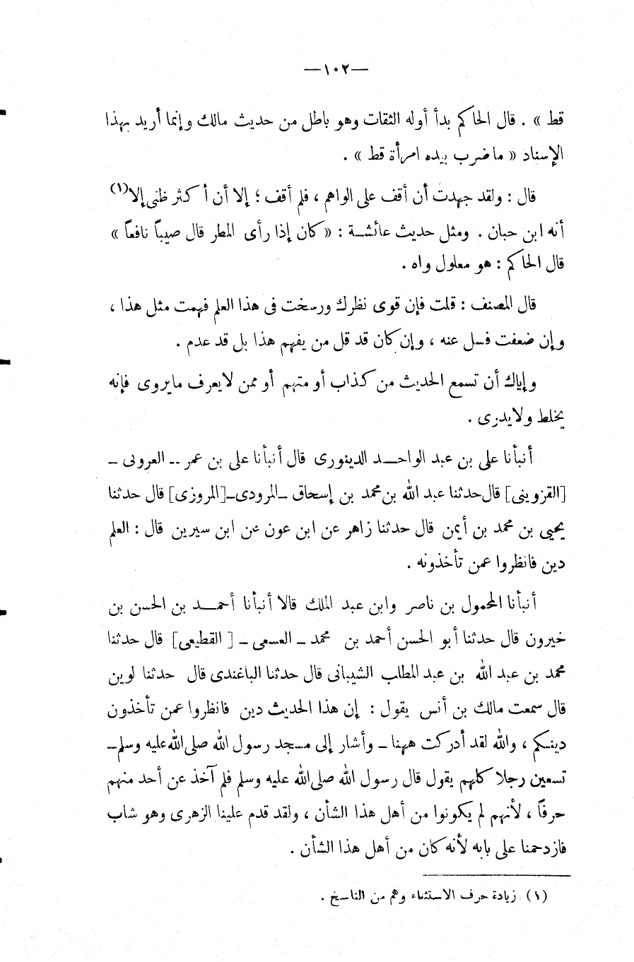 قَالَ سَمِعت مَالك بن أنس يَقُول: إِن هَذَا الحَدِيث دين فانظروا عَمَّن تأخذون دينكُمْ، وَالله لقد أدْركْت هَهُنَا وَأَشَارَ إِلَى مَسْجِد رَسُول الله صَلَّى اللَّهُ عَلَيْهِ وَسَلَّمَ تسعين رجلا كلهم يَقُول قَالَ رَسُول الله صَلَّى اللَّهُ عَلَيْهِ وَسَلَّمَ فَلم آخذ عَن أحد مِنْهُم حرفا، لأَنهم لم يَكُونُوا من أهل هَذَا الشَّأْن، وَلَقَد قدم علينا الزُّهْرِيّ وَهُوَ شَاب فازدحمنا على بَابه لِأَنَّهُ كَانَ من أهل هَذَا الشَّأْن.