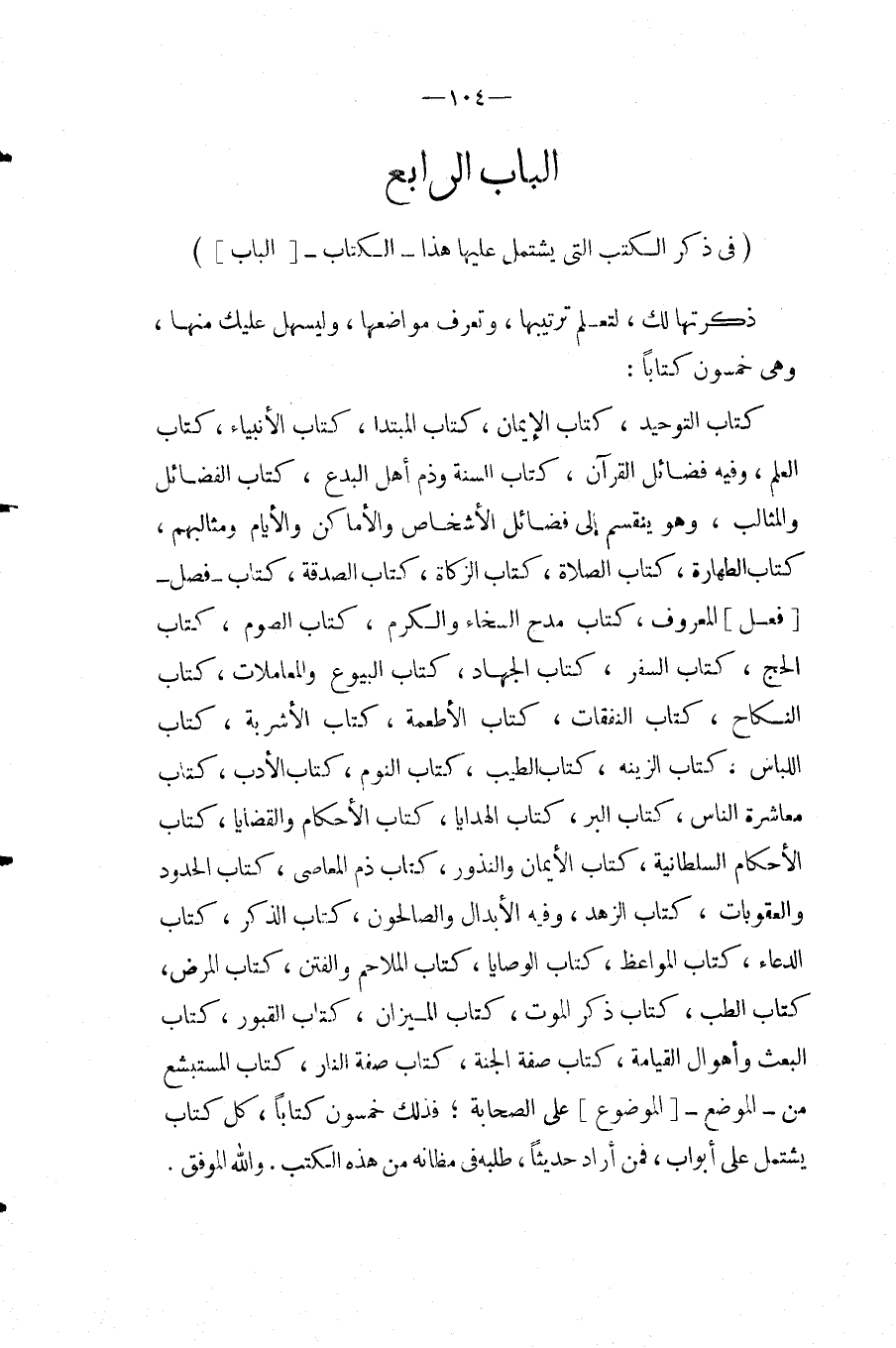 ذكرتها لَك، لتعلم ترتيبها، وتعرف موَاضعهَا، وليسهل عَلَيْك مِنْهَا، وهى خَمْسُونَ كتابا: كتاب التَّوْحِيد، كتاب الْإِيمَان، كتاب الْمُبْتَدَأ، كتاب الْأَنْبِيَاء، كتاب الْعلم، وَفِيه فَضَائِل الْقُرْآن، كتاب السّنة وذم أهل الْبدع، كتاب الْفَضَائِل والمثالب، وَهُوَ يَنْقَسِم إِلَى فَضَائِل الْأَشْخَاص والأماكن وَالْأَيَّام ومثالبهم، كتاب الطَّهَارَة، كتاب الصَّلَاة، كتاب الزَّكَاة، كتاب الصَّدَقَة، كتاب فصل [فعل] الْمَعْرُوف، كتاب مدح السخاء وَالْكَرم، كتاب الصَّوْم، كتاب الْحَج، كتاب السّفر، كتاب الْجِهَاد، كتاب الْبيُوع والمعاملات، كتاب النِّكَاح، كتاب النَّفَقَات، كتاب الْأَطْعِمَة، كتاب الْأَشْرِبَة، كتاب اللبَاس، كتاب الزِّينَة، كتاب الطّيب، كتاب النّوم، كتاب الْأَدَب، كتاب معاشرة النَّاس، كتاب الْبر، كتاب الْهَدَايَا، كتاب الْأَحْكَام والقضايا، كتاب