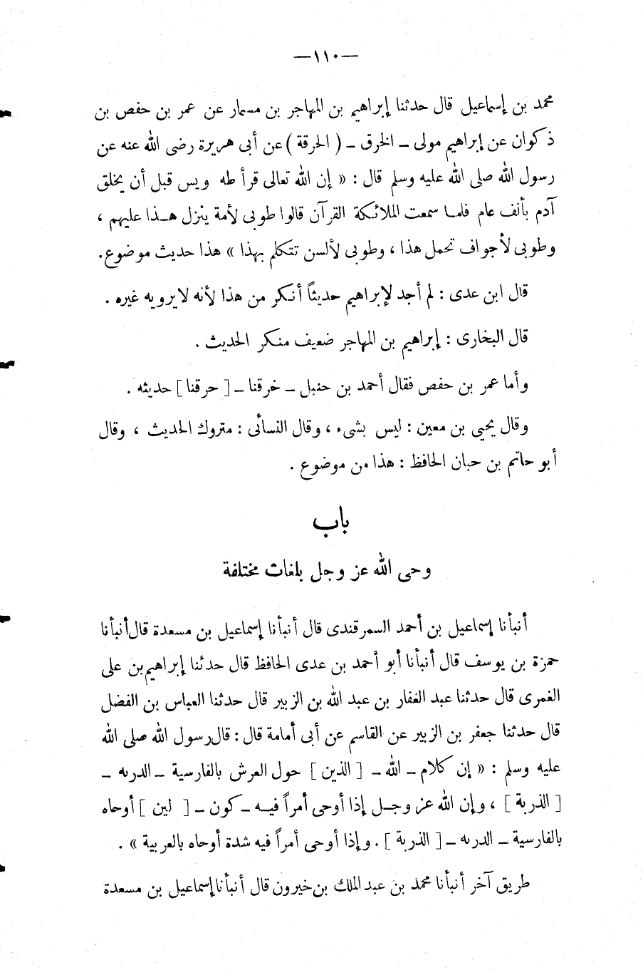 مُحَمَّدُ بُن إِسْمَاعِيلَ قَالَ حَدَّثَنَا إِبْرَاهِيمُ بْنُ الْمُهَاجِرِ بْنِ مُسْمَارٍ عَنْ عُمَرَ بْنِ حَفْصِ بْنِ ذكْوَان عَن إِبْرَاهِيم مولى الْخرق (الْحَرِقَةِ) عَنْ أَبِي هُرَيْرَةَ رَضِيَ اللَّه عَنْهُ عَنْ رَسُولِ اللَّهِ صَلَّى اللَّهُ عَلَيْهِ وَسَلَّمَ قَالَ: " أَنَّ اللَّهَ تَعَالَى قَرَأَ طه وَيس قَبْلَ أَنْ يَخْلُقَ آدَمَ بِأَلْفِ عَامٍ فَلَمَّا سَمِعَتِ الْمَلائِكَةُ الْقُرْآنَ قَالُوا طُوبَى لأُمَّةٍ يَنْزِلُ هَذَا عَلَيْهِمْ، وَطُوبَى لأَجْوَافٍ تَحْمِلُ هَذَا، وَطُوبَى لأَلْسُنٍ تَتَكَلَّمُ بِهَذَا " هَذَا حَدِيثٌ مَوْضُوعٌ.
