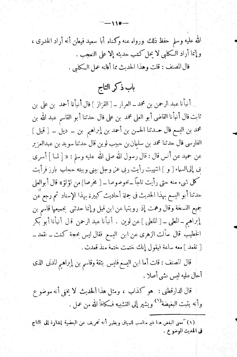 بَاب ذكر التَّاج أَنبأَنَا عبد الرحمن بن مُحَمَّد العرار [الْقَزاز] قَالَ أَنبأَنَا أَحْمد بن عَليّ بن ثَابت قَالَ أَنبأَنَا الْقَاضِي أَبُو الْعُلَى مُحَمَّدُ بْنُ عَلِيٍّ قَالَ حَدَّثَنَا أَبُو الْقَاسِمِ عبد الله بْنُ مُحَمَّدِ بْنِ الْيَسَعَ قَالَ حَدَّثَنَا الْحَسَنُ بْنُ أَحْمَدَ بْنِ إِبْرَاهِيم بن ديل [قَيْلٍ] الْفَارِسِيُّ قَالَ حَدَّثَنَا مُحَمَّدُ بْنُ سُلَيْمَانَ بْنِ حَبِيبٍ لُوَيْنُ قَالَ حَدَّثَنَا سُوَيْدُ بْنُ عَبْدِ الْعَزِيزِ عَنْ حُمَيْدٍ عَنْ أَنَسٍ قَالَ: قَالَ رَسُول الله صَلَّى اللَّهُ عَلَيْهِ وَسَلَّمَ: [لما] أسرى بى إِلَى السَّمَاء [و] انْتَهَيْت رَأَيْت ربى عزوجل بَيْنِي وَبَيْنَهُ حِجَابٌ بَارِزٌ فَرَأَيْتُ كل شئ مِنْهُ حَتَّى رَأَيْت تاجا بحوصوصا [مُخْرَصًا] مِنْ لُؤْلُؤٍ " قَالَ أَبُو الْعَلِيِّ حَدَّثَنَا أَبُو الْيَسَعَ بِهَذَا الْحَدِيثِ فِي جُمْلَةِ أَحَادِيثَ كَبِيرَةٍ بِهَذَا الإِسْنَادِ ثُمَّ رَجَعَ عَنْ جَمِيعِ النُّسْخَةِ وَقَالَ وَهِمْتُ إِذْ رَوَيْتُهَا عَنِ ابْنِ قَيْلٍ وَإِنَّمَا حَدَّثَنِي بِجَمِيعِهَا قَاسِمُ بْنُ إِبْرَاهِيمَ المطى [المطلى] عَن لوين.