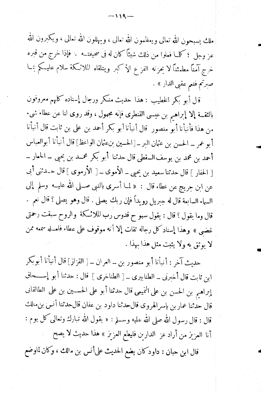 قَالَ أَبُو بَكْرٍ الْخَطِيبُ: هَذَا حَدِيثٌ مُنْكَرٌ وَرِجَالُ إِسْنَادِهِ كُلُّهُمْ مَعْرُوفُونَ بِالثِّقَةِ إِلا إِبْرَاهِيمَ بْنَ عِيسَى الْقَنْطَرِيَّ فَإِنَّهُ مَجْهُولٌ، وَقَدْ رُوِيَ لنا عَن عَطاء شئ من هَذَا فَأَنْبَأَنَا أَبُو مَنْصُورٍ قَالَ أَنْبَأَنَا أَبُو بكر أَحْمد بن عَليّ بن ثَابت قَالَ أَنبأَنَا أَبُو عُمَرَ الْحَسَنُ بْنُ عُثْمَانَ الْبَرُّ [الْحُسَيْنُ بْنُ عُثْمَانَ الْوَاعِظُ] قَالَ أَنْبَأَنَا أَبُو الْعَبَّاسِ أَحْمَدُ بْنُ مُحَمَّدِ بْنِ يُوسُفَ السَّقَطِيُّ قَالَ حَدَّثَنَا أَبُو بَكْرٍ مُحَمَّدُ بْنُ يحيى الحعار [الحَّفَّارُ] قَالَ حَدَّثَنَا سَعِيدُ بْنُ يحيى الاموى [الازموى] قَالَ حَدَّثَنى أَبى م ن ابْن جريج عَن عَطاء قَالَ: " لَمَّا أُسْرِيَ بِالنَّبِيِّ صَلَّى اللَّهُ عَلَيْهِ وَسَلَّمَ إِلَى