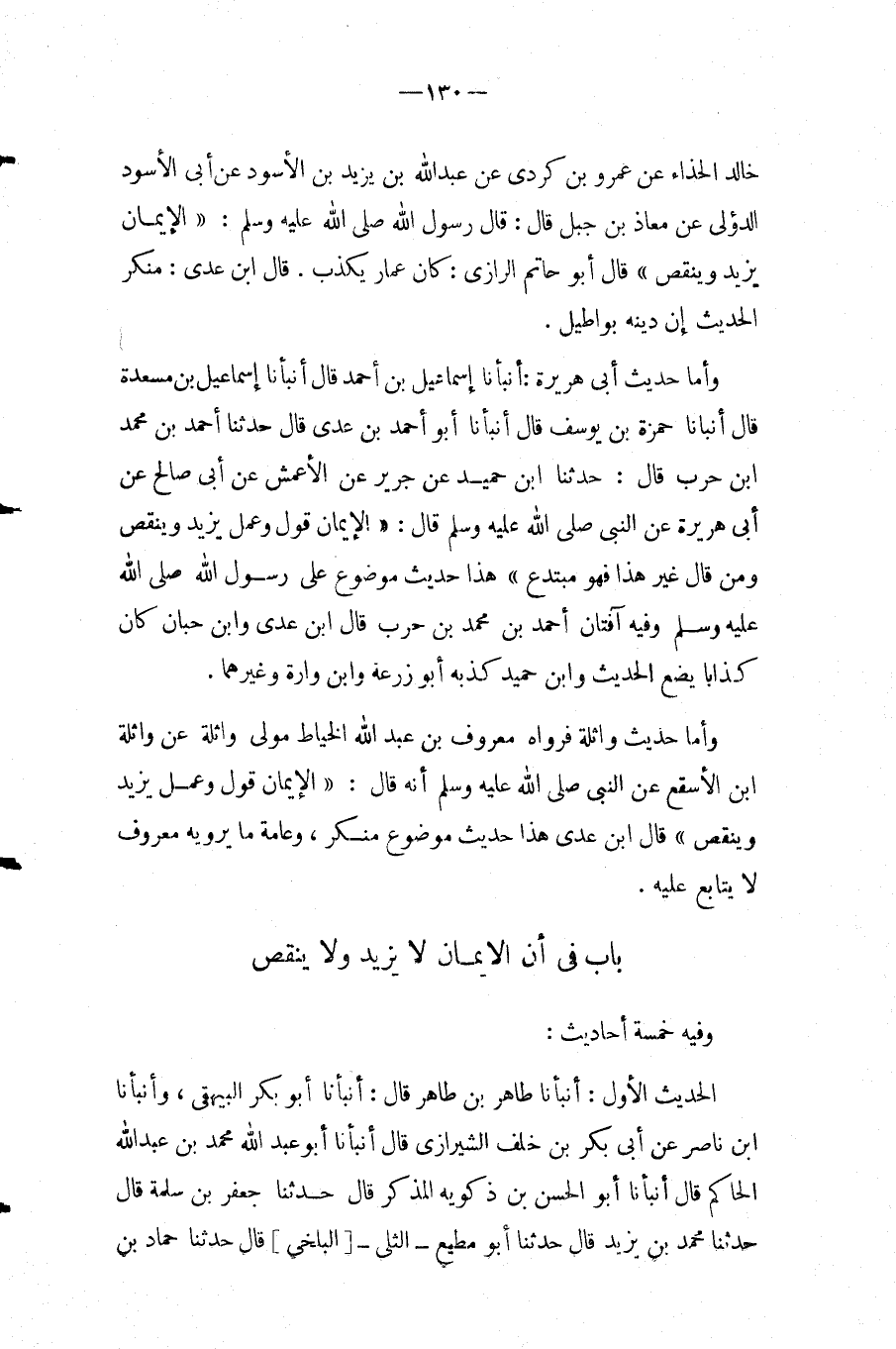 بَاب فِي أَن الْإِيمَان لَا يزِيد وَلَا ينقص وَفِيه خَمْسَة أَحَادِيث: الحَدِيث الأول: أَنْبَأَنَا طَاهِرُ بْنُ طَاهِرٍ قَالَ: أَنْبَأَنَا أَبُو بَكْرٍ الْبَيْهَقِيُّ، وَأَنْبَأَنَا ابْنُ نَاصِرٍ عَنْ أبي بكر بن خلف الشِّيرَازِيّ قَالَ أَنبأَنَا أَبُو عبد الله مُحَمَّد بن عبد الله الْحَاكِمُ قَالَ أَنْبَأَنَا أَبُو الْحَسَنِ بْنُ ذَكْوَيْهِ الْمُذَكَّرُ قَالَ حَدَّثَنَا جَعْفَرُ بْنُ سَلَمَةَ قَالَ حَدَّثَنَا مُحَمَّدُ بْنُ يَزِيدَ قَالَ حَدَّثَنَا أَبُو مُطِيع الثلى [الْبَلْخِيُّ] قَالَ حَدَّثَنَا حَمَّادُ بْنُ