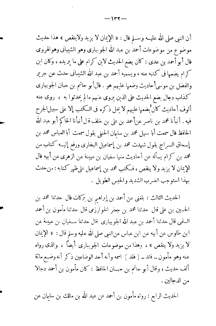 الحَدِيث الثَّالِث: بَلَغَنِي عَنْ أَحْمَدَ بْنِ إِبْرَاهِيمَ بْنِ بَرَكَاتٍ قَالَ حَدَّثَنَا مُحَمَّدُ بْنُ الْحُسَيْنِ بْنِ عَلِيٍّ قَالَ حَدَّثَنَا مُحَمَّدُ بْنُ جَعْفَرٍ الْخَوَارِزْمِيُّ قَالَ حَدَّثَنَا مَأْمُونُ بْنُ أَحْمَدَ السُّلَمِيُّ قَالَ حَدَّثَنَا أَحْمَدُ بن عبد الله الْجُوَيْبَارِيُّ قَالَ حَدَّثَنَا سُفْيَانُ بْنُ عُيَيْنَة عَن ابْن طَاوُوس عَنْ أَبِيهِ عَنِ ابْنِ عَبَّاسٍ عَن النَّبِي صَلَّى اللَّهُ عَلَيْهِ وَسَلَّمَ قَالَ: " الإِيمَانُ لَا يَزِيدُ وَلا يَنْقُصُ "، وَهَذَا مِنْ مَوْضُوعَاتِ الْجَوَيْبَارِيِّ أَيْضًا، وَالَّذِي رَوَاهُ عَنْهُ وَهُوَ مَأْمُون فثد [فُقِدَ] اسْمُهُ وَأَنَّهُ أَحَدُ الْوَضَّاعِينَ ذُكِرَ أَنَّهُ وَضَعَ مِائَةَ أَلْفِ حَدِيثٍ، وَقَالَ أَبُو حَاتِمِ بْنُ حِبَّانَ الَحاِفُظ: كَانَ مَأْمُونُ بْنُ أَحْمد دجالًا من الدجالين.