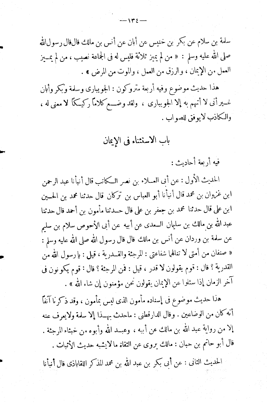 بَاب الِاسْتِثْنَاء فِي الْإِيمَان فِيهِ أَرْبَعَة أَحَادِيث: الحَدِيث الأول: عَنْ أَبِي الْعَلاءِ بْنِ نَصْرٍ الْكَاتِبِ قَالَ أَنبأَنَا عبد الرحمن ابْن غَزْوَانَ بْنِ مُحَمَّدٍ قَالَ أَنْبَأَنَا أَبُو الْعَبَّاسِ بْنُ تَرْكَانَ قَالَ حَدثنَا مُحَمَّد بن الْحُسَيْن ابْن عَلِيٍّ قَالَ حَدَّثَنَا مُحَمَّدُ بْنُ جَعْفَرِ بْنِ عَلِيٍّ قَالَ حَدَّثَنَا مَأْمُونُ بْنُ أَحْمَدَ قَالَ حَدَّثَنَا عبد الله بْنُ مَالِكِ بْنِ سُلَيْمَانَ السَّعْدِيُّ عَنْ أَبِيهِ عَنْ أَبِي الأَحْوَصِ سَلامُ بْنُ سُلَيْمٍ
