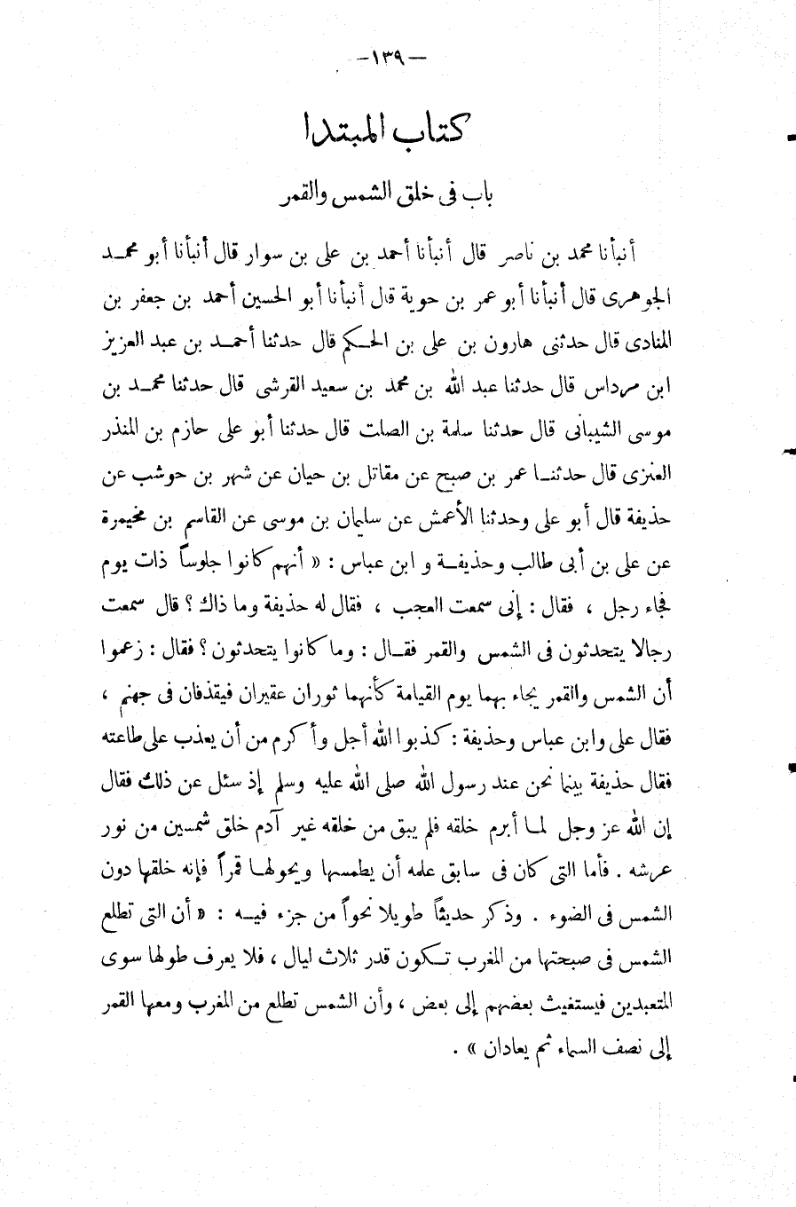 أَنْبَأَنَا مُحَمَّدُ بْنُ نَاصِرٍ قَالَ أَنبأَنَا أَحْمد بن عَليّ بن سَوَّارٍ قَالَ أَنْبَأَنَا أَبُو مُحَمَّدٍ الْجَوْهَرِيُّ قَالَ أَنْبَأَنَا أَبُو عُمَرَ بْنُ حَوِيَّةَ قَالَ أَنْبَأَنَا أَبُو الْحُسَيْنِ أَحْمَدُ بْنُ جَعْفَرِ بْنِ الْمُنَادِي قَالَ حَدَّثَنِي هَارُونُ بْنُ عَلِيِّ بْنِ الْحَكَمِ قَالَ حَدَّثَنَا أَحْمد بن عبد الْعَزِيز ابْن مرداس قَالَ حَدثنَا عبد الله بْنُ مُحَمَّدِ بْنِ سَعِيدٍ الْقُرَشِيُّ قَالَ حَدَّثَنَا مُحَمَّدُ بْنُ مُوسَى الشَّيْبَانِيُّ قَالَ حَدَّثَنَا سَلَمَةُ بْنُ الصَّلْتِ قَالَ حَدَّثَنَا أَبُو عَلِيٍّ حَازِمُ بْنُ الْمُنْذِرِ الْعَنَزِيُّ قَالَ حَدَّثَنَا عُمَرُ بْنُ صُبْحٍ عَنْ مُقَاتِلِ بْنِ حَيَّانَ عَنْ شَهْرِ بْنِ حَوْشَبٍ عَنْ حُذَيْفَةَ قَالَ أَبُو عَلِيٍّ وَحَدَّثَنَا الأَعْمَشُ عَنْ سُلَيْمَانَ بْنِ مُوسَى عَنِ الْقَاسِمِ بْنِ مُخَيْمِرَةَ عَنْ عَلِيِّ بْنِ أَبِي طَالِبٍ وَحُذَيْفَةَ وَابْنِ عَبَّاسٍ: " أَنَّهُمْ كَانُوا جُلُوسًا ذَاتَ يَوْمٍ فَجَاءَ رَجُلٌ، فَقَالَ: إِنِّي سَمِعْتُ الْعَجَبَ، فَقَالَ لَهُ حُذَيْفَةُ وَمَا ذَاكَ؟ قَالَ سَمِعْتُ رِجَالا يَتَحَدَّثُونَ فِي الشَّمْسِ وَالْقَمَرِ فَقَالَ: وَمَا كَانُوا يَتَحَدَّثُونَ؟ فَقَالَ: زَعَمُوا أَنَّ الشَّمْسَ وَالْقَمَر يُجَاءُ بِهِمَا يَوْمَ الْقِيَامَةِ كَأَنَّهُمَا ثَوْرَانِ عَقِيرَانِ فَيُقْذَفَانِ فِي جَهَنَّمَ، فَقَالَ عَلِيٌّ وَابْنُ عَبَّاسٍ وَحُذَيْفَةُ: كَذَبُوا اللَّهُ أَجَلُّ وَأَكْرَمُ مِنْ أَنْ يُعَذِّبَ عَلَى طَاعَتِهِ فَقَالَ حُذَيْفَةُ بَيْنَمَا نَحْنُ عِنْدَ رَسُولِ اللَّهِ صَلَّى اللَّهُ عَلَيْهِ وَسَلَّمَ إِذْ سُئِلَ عَنْ ذَلِك فَقَالَ إِن الله عزوجل لَمَّا أَبْرَمَ خَلْقَهُ فَلَمْ يَبْقَ مِنْ خَلْقِهِ غَيْرَ آدَمَ خَلَقَ شَمْسَيْنِ مِنْ نُورِ عَرْشِهِ.