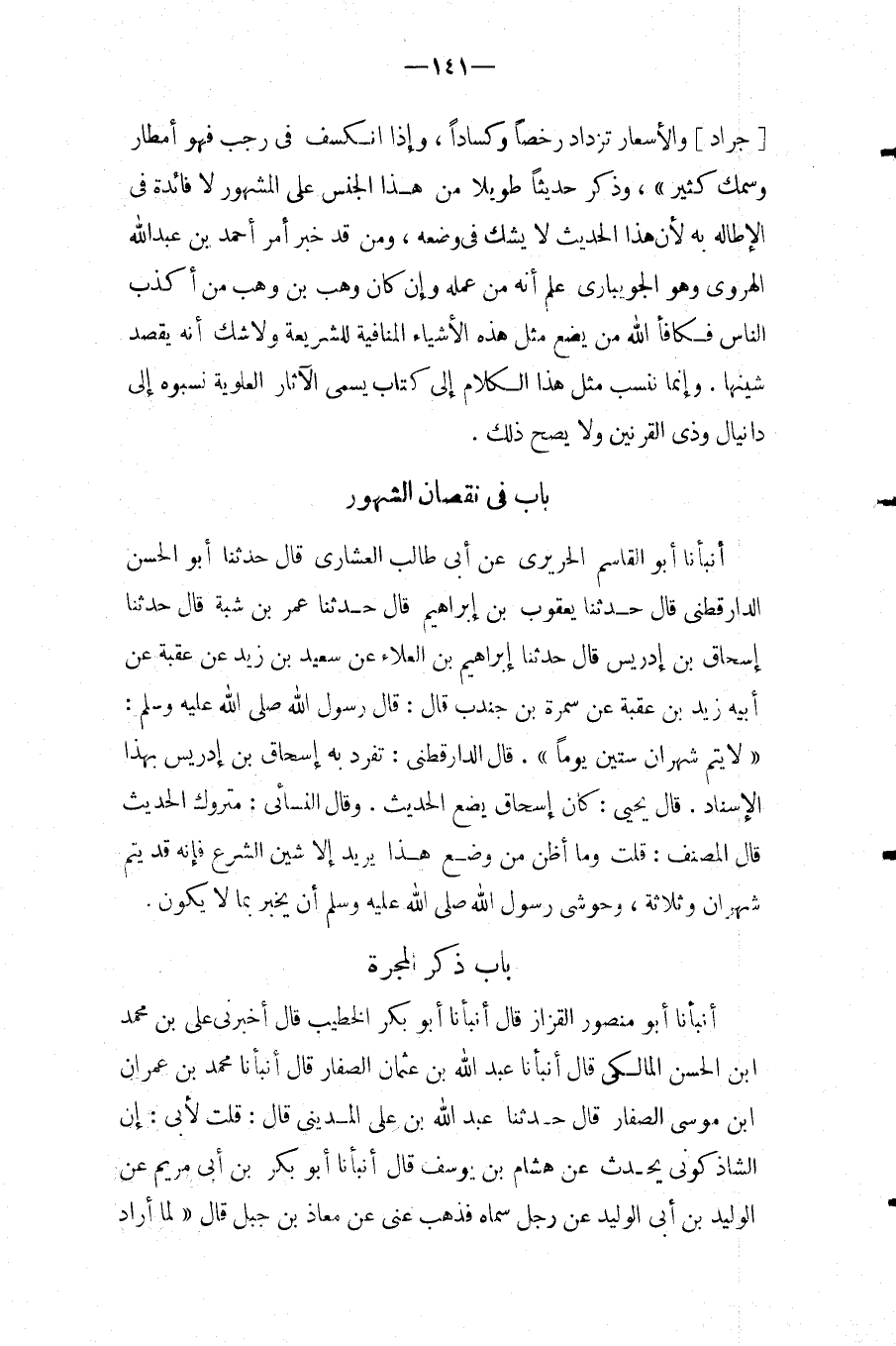 بَاب فِي نُقْصَان الشُّهُور أَنبأَنَا أَبُو الْقَاسِمِ الْحَرِيرِيُّ عَنْ أَبِي طَالِبٍ الْعُشَارِيِّ قَالَ حَدَّثَنَا أَبُو الْحَسَنِ الدَّارَقُطْنِيُّ قَالَ حَدَّثَنَا يَعْقُوبُ بْنُ إِبْرَاهِيمَ قَالَ حَدَّثَنَا عُمَرُ بْنُ شَبَّةَ قَالَ حَدَّثَنَا إِسْحَاقُ بْنُ إِدْرِيسَ قَالَ حَدَّثَنَا إِبْرَاهِيمُ بْنُ الْعَلاءِ عَنْ سَعِيدِ بْنِ زَيْدٍ عَنْ عُقْبَةَ عَنْ أَبِيهِ زَيْدِ بْنِ عُقْبَةَ عَنْ سَمُرَةَ بْنِ جُنْدُبٍ قَالَ: قَالَ رَسُولُ الله صَلَّى اللَّهُ عَلَيْهِ وَسَلَّمَ: " لايتم شَهْرَانِ سِتِّينَ يَوْمًا ".