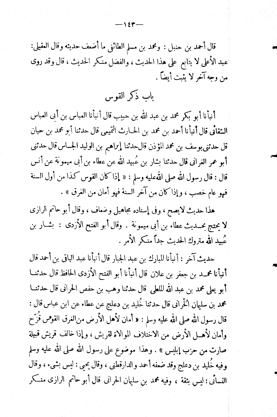 بَاب ذكر الْقوس أَنبأَنَا أَبُو بكر مُحَمَّد بن عبد الله بْنِ حَبِيبٍ قَالَ أَنْبَأَنَا الْعَبَّاسُ بْنُ أَبِي الْعَبَّاسِ السَّقَّائِيُّ قَالَ أَنْبَأَنَا أَحْمَدُ بْنُ مُحَمَّدِ بْنِ الْحَارِثِ التَّمِيمِيُّ قَالَ حَدَّثَنَا أَبُو مُحَمَّدِ بْنُ حَيَّانَ قَالَ حَدَّثَنِي يُوسُفُ بْنُ مُحَمَّدٍ الْمُؤَذِّنُ قَالَ حَدَّثَنَا إِبْرَاهِيمُ بْنُ الْوَلِيدِ الْجَسَّاسُ قَالَ حَدَّثَنِي أَبُو عُمَرَ الْغُرَّانِيُّ قَالَ حَدثنَا بشار بن عبيد الله عَنْ عَطَاءِ بْنِ أَبِي مَيْمُونَةَ عَنْ أَنْسٍ قَالَ: قَالَ رَسُولُ الله صَلَّى اللَّهُ عَلَيْهِ وَسَلَّمَ: " إِذَا كَانَ الْقَوْسُ كَذَا مِنْ أَوَّلِ السَّنَةِ فَهُوَ عَامٌ خِصْبٌ، وَإِذَا كَانَ مِنْ آخِرِ السَّنَةِ فَهُوَ أَمَانٌ مِنَ الْغَرَقِ ".