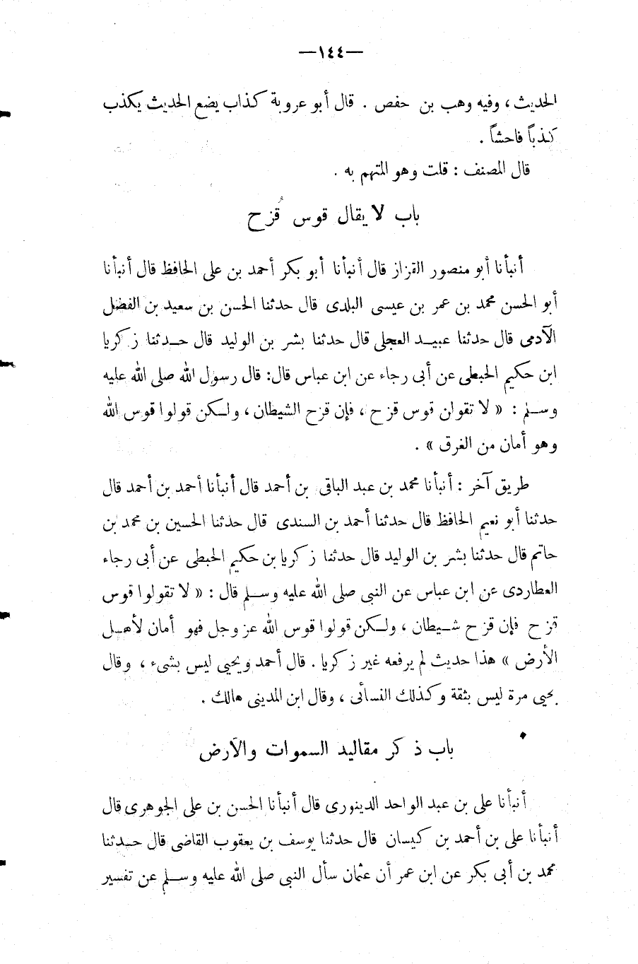 بَاب لَا يُقَال قَوس قزَح أَنبأَنَا أَبُو مَنْصُور الْقَزاز قَالَ أَنبأَنَا أَبُو بكر أَحْمد بن عَلِيٍّ الْحَافِظُ قَالَ أَنْبَأَنَا أَبُو الْحَسَنِ مُحَمَّدُ بْنُ عُمَرَ بْنِ عِيسَى الْبَلَدِيُّ قَالَ حَدَّثَنَا الْحَسَنُ بْنُ سَعِيدِ بْنِ الْفَضْلِ الآدَمِيُّ قَالَ حَدَّثَنَا عُبَيْدٌ الْعِجْلِيُّ قَالَ حَدَّثَنَا بِشْرُ بْنُ الْوَلِيدِ قَالَ حَدثنَا زَكَرِيَّا ابْن حَكِيمٍ الْحَبَطِيُّ عَنْ أَبِي رَجَاءٍ عَنِ ابْنِ عَبَّاسٍ قَالَ: قَالَ رَسُول الله صَلَّى اللَّهُ عَلَيْهِ وَسَلَّمَ: " لَا تَقُولُنَّ قَوْسَ قُزَحَ، فَإِنَّ قُزَحَ الشَّيْطَانُ، وَلَكِنْ قُولُوا قَوْسُ اللَّهِ وَهُوَ أَمَانٌ مِنَ الْغَرَقِ ".