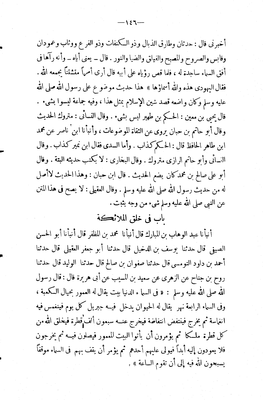 بَاب فِي خلق الْمَلَائِكَة أَنبأَنَا عبد الْوَهَّاب بن الْمُبَارك قَالَ أَنْبَأَنَا مُحَمَّدُ بْنُ الْمُظَفَّرِ قَالَ أَنْبَأَنَا مُحَمَّدُ بْنُ الْمُظَفَّرِ قَالَ أَنْبَأَنَا أَبُو الْحَسَنِ الصَّيْفِيُّ قَالَ حَدثنَا يُوسُف بن الدخيل قَالَ حَدثنَا أَبُو جَعْفَر الْعقيلِيّ قَالَ حَدَّثَنَا أَحْمَدُ بْنُ دَاوُدَ التومسى قَالَ حَدَّثَنَا صَفْوَانُ بْنُ صَالِحٍ قَالَ حَدَّثَنَا الْوَلِيدُ قَالَ حَدَّثَنَا رَوْحُ بْنُ جَنَاحٍ عَنِ الزُّهْرِيِّ عَن سعيد بن الْمسيب عَن أَبِي هُرَيْرَةَ قَالَ: قَالَ رَسُولُ الله صَلَّى اللَّهُ عَلَيْهِ وَسَلَّمَ: " فِي السَّمَاءِ الدُّنْيَا بَيْتٌ يُقَالُ لَهُ العمور بِحِيَالِ الْكَعْبَةِ،