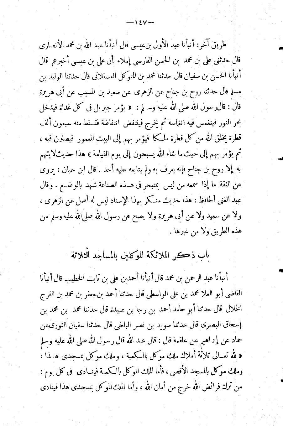 بَاب ذكر الْمَلَائِكَة الموكلين بالمساجد الثَّلَاثَة أَنبأَنَا عبد الرحمن بْنُ مُحَمَّدٍ قَالَ أَنْبَأَنَا أَحْمَدُ بْنُ عَلِيِّ بْنِ ثَابِتٍ الْخَطِيبُ قَالَ أَنبأَنَا القاضى أبوالعلا مُحَمَّدُ بْنُ عَلِيٍّ الْوَاسِطِيُّ قَالَ حَدثنَا أَحْمد بن جَعْفَر بن مُحَمَّدِ بْنِ الْفَرَجِ