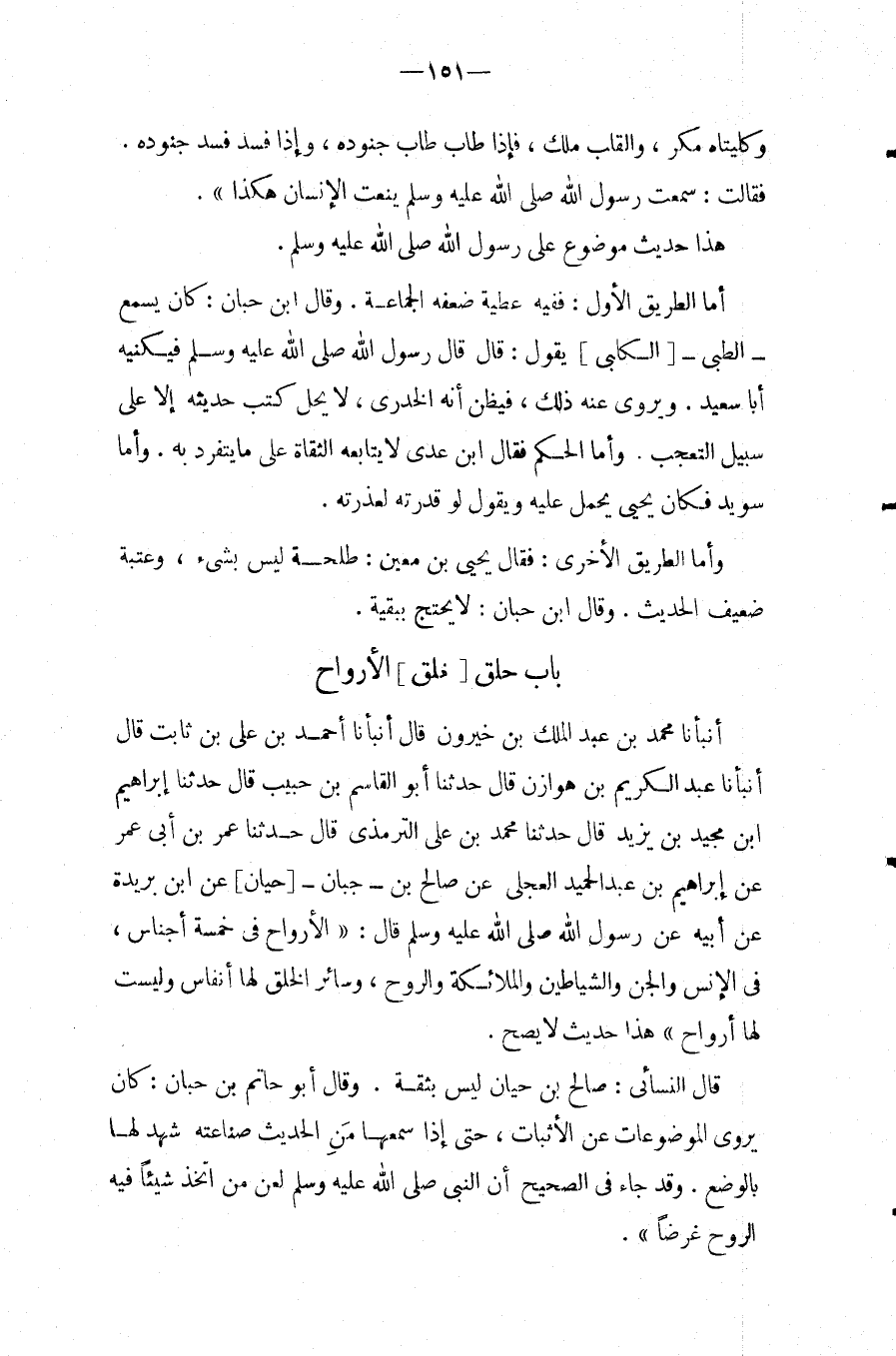 عَن إِبْرَاهِيم بن عبد الحميد العجلى عَن صَالح بن جبان [حَيَّانَ] عَنِ ابْنِ بُرَيْدَةَ عَنْ أَبِيهِ عَنْ رَسُولِ اللَّهِ صَلَّى اللَّهُ عَلَيْهِ وَسَلَّمَ قَالَ: " الأَرْوَاحُ فِي خَمْسَةِ أَجْنَاسٍ، فِي الإِنْسِ وَالْجِنِّ وَالشَّيَاطِينِ وَالْمَلائِكَةِ وَالرُّوحِ، وَسَائِرِ الْخَلْقِ لَهَا أَنْفَاسٌ وَلَيْسَتْ لَهَا أَرْوَاحٌ " هَذَا حَدِيثٌ لَا يَصِحُّ.