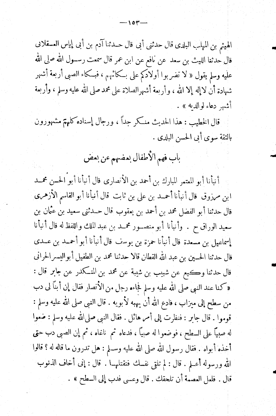 بَاب فهم الاطفال بَعضهم عَن بعض أَنبأَنَا أَبُو الْمُعْتَمِرِ الْمُبَارَكُ بْنُ أَحْمَدَ بْنِ الأَنْصَارِيِّ قَالَ أَنْبَأَنَا أَبُو الْحسن مُحَمَّد ابْن مَرْزُوقٍ قَالَ أَنْبَأَنَا أَحْمَدُ بْنُ عَليّ بن ثَابت قَالَ أَنبأَنَا أَبُو الْقَاسِم الْأَزْهَرِي قَالَ حَدثنَا أَبُو الْفَضْلِ مُحَمَّدُ بْنُ أَحْمَدَ بْنِ يَعْقُوبَ قَالَ حَدَّثَنِي سَعِيدُ بْنُ عُثْمَانَ بْنِ سَعِيدٍ الْوَرَّاقُ ح.