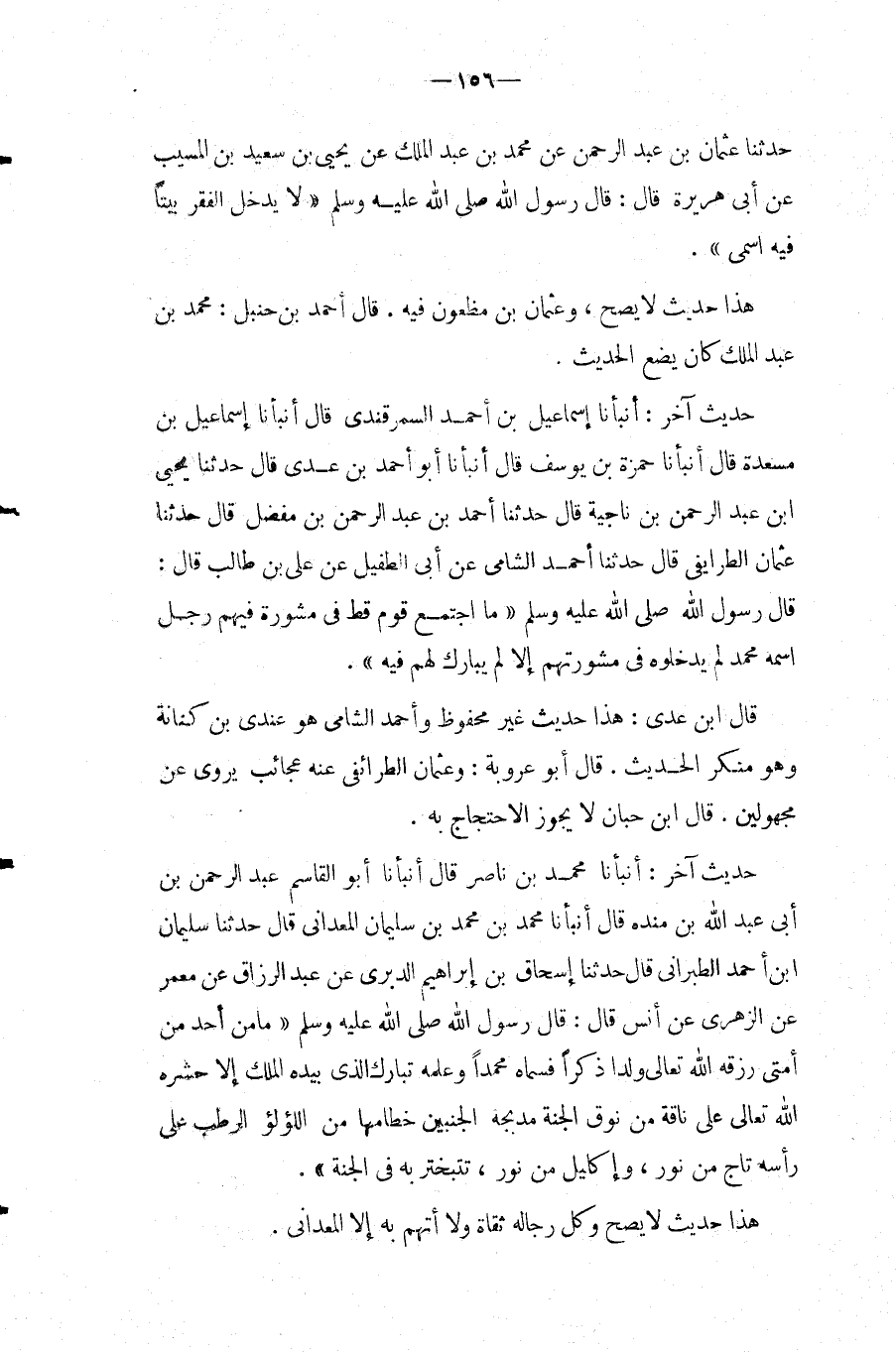 حَدثنَا عُثْمَان بن عبد الرحمن عَن مُحَمَّد بن عبد الملك عَنْ يَحْيَى بْنِ سَعِيدِ بْنِ الْمُسَيِّبِ عَنْ أَبِي هُرَيْرَةَ قَالَ: قَالَ رَسُول الله صَلَّى اللَّهُ عَلَيْهِ وَسَلَّمَ " لَا يَدْخُلُ الْفَقْرَ بَيْتًا فِيهِ اسْمِي ".