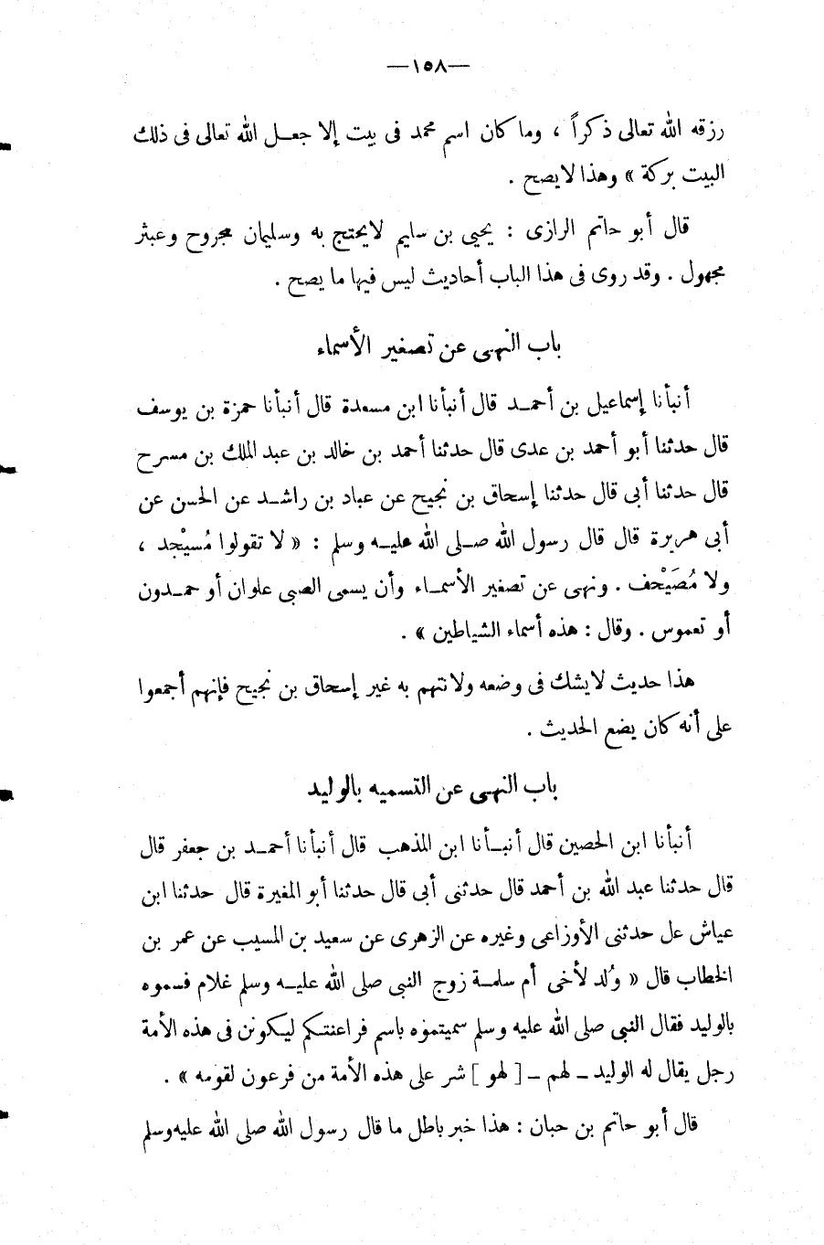 وَنَهَى عَنْ تَصْغِيرِ الأَسْمَاءِ وَأَنْ يُسَمَّى الصَّبِيُّ عُلْوَانُ أَوْ حَمْدُونٌ
