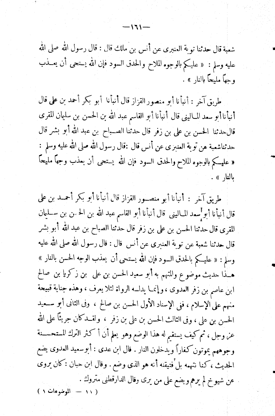 قَالَ أَنْبَأَنَا أَبُو سَعْدٍ الْمَالِينِيُّ قَالَ أَنبأَنَا أَبُو الْقَاسِم عبد الله بْنُ الْحَسَنِ بْنِ سُلَيْمَانَ الْمُقْرِيُّ قَالَ حَدَّثَنَا الْحَسَنُ بْنُ عَلِيِّ بْنِ زُفَرٍ قَالَ حَدَّثَنَا الصَّبَّاحُ بن عبد الله أَبُو بِشْرٍ قَالَ حَدَّثَنَا شُعْبَةُ عَنْ تَوْبَةَ الْعَنْبَرِيِّ عَنْ أَنَسٍ قَالَ: قَالَ رَسُول الله صَلَّى اللَّهُ عَلَيْهِ وَسَلَّمَ: " عَلَيْكُمْ بِالْحِدَقِ السُّودِ فَإِنَّ اللَّهَ يَسْتَحِي أَنْ يُعَذِّبَ الْوَجْهَ الْحَسَنَ بِالنَّارِ " هَذَا حَدِيثٌ مَوْضُوعٌ وَالْمُتَّهَمُ بِهِ أَبُو سَعِيدٍ الْحَسَنُ بْنُ عَلِيِّ بْنِ زَكَرِيَّا بن صَالح ابْن عَاصِمِ بْنِ زُفَرَ الْعَدَوِيُّ، وَإِنَّمَا يُدَلِّسُهُ الرُّوَاةُ لِئَلا يُعْرَفَ، وَهَذِهِ جِنَايَةٌ قَبِيحَةٌ مِنْهُمْ عَلَى الإِسْلامِ، فَفِي الإِسْنَادِ الأَوَّلِ الْحَسَنُ بْنُ صَالِحٍ، وَفِي الثَّانِي أَبُو سَعِيدٍ الْحَسَنُ بْنُ عَلِيٍّ، وَفِي الثَّالِثِ الْحَسَنُ بْنُ عَلِيِّ بْنِ زُفَرٍ، وَلَقَد كَانَ جريثا على الله عزوجل، ثُمَّ كَيْفَ يَسْتَقِيمُ لَهُ هَذَا الْوَضْعُ وَهُوَ يَعْلَمُ أَنَّ أَكْثَرَ التَّرْكِ الْمُسْتَحْسِنَةُ وُجُوهُهُمْ يَمُوتُونَ كُفَّارًا وَيَدْخُلُونَ النَّارَ.
