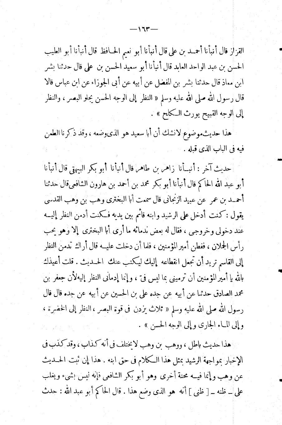 قُلْتُ أُعِيذُكَ بِاللَّهِ يَا أَمِيرَ الْمُؤْمِنِينَ أَنْ تَرْمِيَنِي بِمَا لَيْسَ فِيَّ، وَإِنَّمَا إِدْمَانِي النَّظَرَ إِلَيْهِ لأَنَّ جَعْفَرَ بْنَ مُحَمَّدٍ الصَّادِقَ حَدَّثَنَا عَنْ أَبِيهِ عَنْ جَدِّهِ عَلِيِّ بْنِ الْحُسَيْنِ عَنْ أَبِيهِ عَنْ جَدِّهِ قَالَ قَالَ رَسُول الله صَلَّى اللَّهُ عَلَيْهِ وَسَلَّمَ " ثَلاثٌ يُزِدْنَ فِي قُوَّةِ الْبَصَرِ، النَّظَرُ إِلَى الْخُضْرَةِ، وَإِلَى الْمَاءِ الْجَارِي وَإِلَى الْوَجِه الْحَسَنِ ".