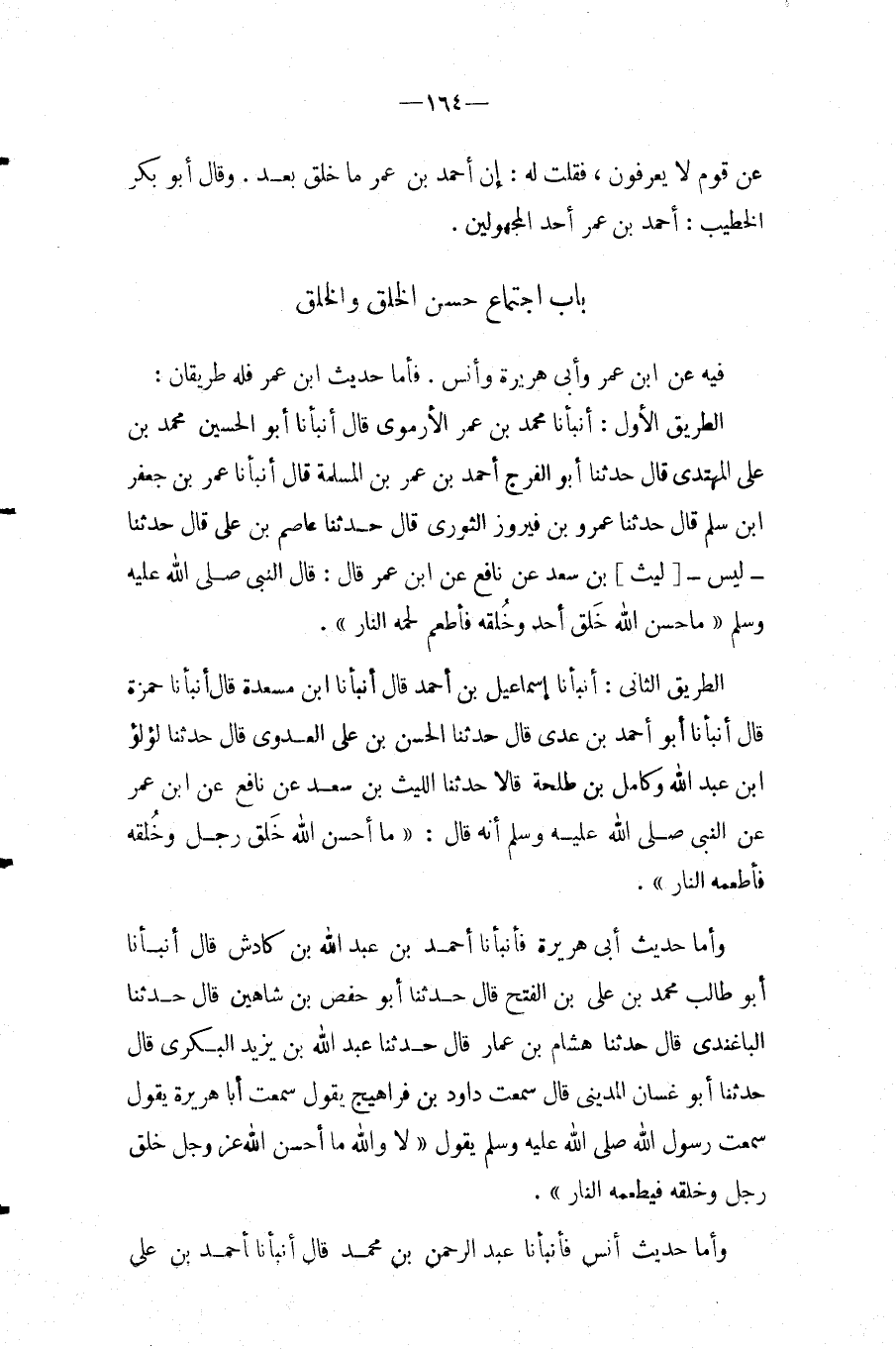 الطَّرِيق الثَّانِي: أَنْبَأَنَا إِسْمَاعِيلُ بْنُ أَحْمَدَ قَالَ أَنْبَأَنَا ابْنُ مَسْعَدَةَ قَالَ أَنْبَأَنَا حَمْزَةُ قَالَ أَنْبَأَنَا أَبُو أَحْمَدَ بْنِ عَدِيٍّ قَالَ حَدَّثَنَا الْحَسَنُ بْنُ عَلِيٍّ الْعَدَوِيُّ قَالَ حَدثنَا لُؤْلُؤ ابْن عبد الله وَكَامِلُ بْنُ طَلْحَةَ قَالا حَدَّثَنَا اللَّيْثُ بْنُ سَعْدٍ عَنْ نَافِعٍ عَنِ ابْنِ عُمَرَ عَنِ النَّبِيِّ صَلَّى اللَّهُ عَلَيْهِ وَسَلَّمَ أَنَّهُ قَالَ: " مَا أَحْسَنَ اللَّهُ خَلْقَ رَجُلٍ وَخُلُقَهُ فَأَطْعَمَهُ النَّارَ ".