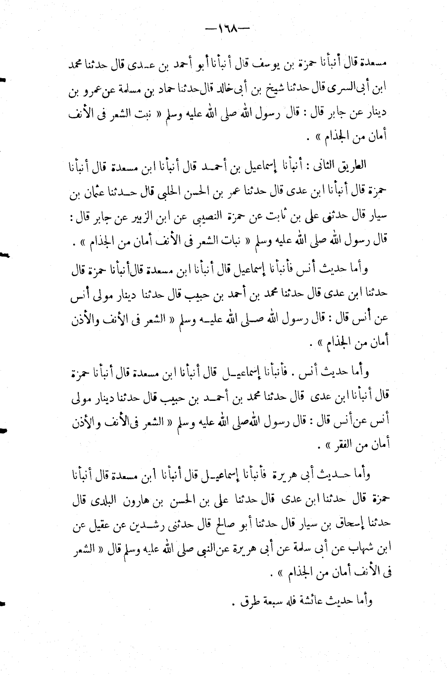 مَسْعَدَةَ قَالَ أَنْبَأَنَا حَمْزَةُ بْنُ يُوسُفَ قَالَ أَنْبَأَنَا أَبُو أَحْمَدَ بْنِ عَدِيٍّ قَالَ حَدَّثَنَا مُحَمَّدُ ابْن أَبِي السَّرِيِّ قَالَ حَدَّثَنَا شَيْخُ بْنُ أَبِي خَالِدٍ قَالَ حَدَّثَنَا حَمَّادُ بْنُ مَسْلَمَةَ عَنْ عَمْرِو بْنِ دِينَارٍ عَنْ جَابِرٍ قَالَ: قَالَ رَسُول الله صَلَّى اللَّهُ عَلَيْهِ وَسَلَّمَ " نَبْتُ الشَّعْرِ فِي الأَنْفِ أَمَانٌ مِنَ الْجُذَامِ ".