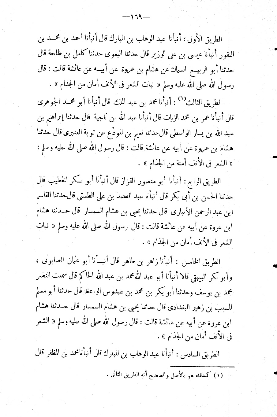 الطَّرِيقُ الأَوَّلُ: أَنْبَأَنَا عَبْدُ الوَهَّابِ بْنُ الْمُبَارَكِ قَالَ أَنْبَأَنَا أَحْمَدُ بْنُ مُحَمَّدِ بْنِ النَّقُّورِ أَنْبَأَنَا عِيسَى بْنُ عَلِيٍّ الْوَزِيرُ قَالَ حَدَّثَنَا الْبَغَوِيُّ حَدَّثَنَا كَامِلُ بْنُ طَلْحَةَ قَالَ حَدَّثَنَا أَبُو الرَّبِيعِ السَّمَّاكُ عَنْ هِشَامِ بْنِ عُرْوَةَ عَنْ أَبِيهِ عَنْ عَائِشَةَ قَالَتْ: قَالَ رَسُول الله صَلَّى اللَّهُ عَلَيْهِ وَسَلَّمَ " نَبَاتُ الشَّعْرِ فِي الأَنْفِ أَمَانٌ مِنَ الْجُذَامِ ".