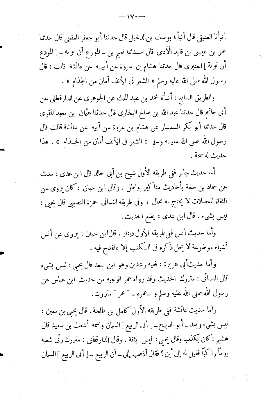 وَالطَّرِيقُ السَّابِعُ: أَنْبَأَنَا مُحَمَّد بن عبد المك عَنِ الْجَوْهَرِيِّ عَنِ الدَّارَقُطْنِيِّ عَنْ أَبى حَاتِم قَالَ حَدثنَا عبد الله بْنُ صَالِحٍ الْبُخَارِيُّ قَالَ حَدَّثَنَا عُثْمَانُ بْنُ مَعْبَدٍ الْمُقْرِيُّ قَالَ حَدَّثَنَا أَبُو بَكْرٍ السِّمْسَارُ عَنْ هِشَامِ بْنِ عُرْوَةَ عَنْ أَبِيهِ عَنْ عَائِشَةَ قَالَتْ قَالَ رَسُولُ الله صَلَّى اللَّهُ عَلَيْهِ وَسَلَّمَ " الشَّعْرِ فِي الأَنْفِ أَمَانٌ مِنَ الْجُذَامِ ".