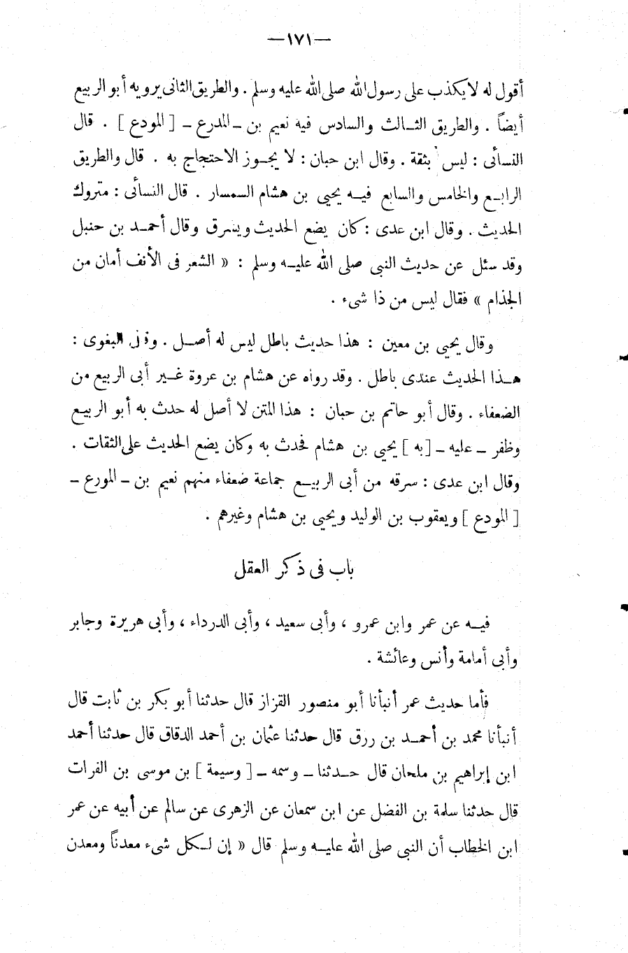 بَاب فِي ذكر الْعقل فِيهِ عَن عمر وَابْن عَمْرو، وَأبي سعيد، وأبى الدَّرْدَاء، وأبى هُرَيْرَة وَجَابِر وأبى أُمَامَة وَأنس وَعَائِشَة.