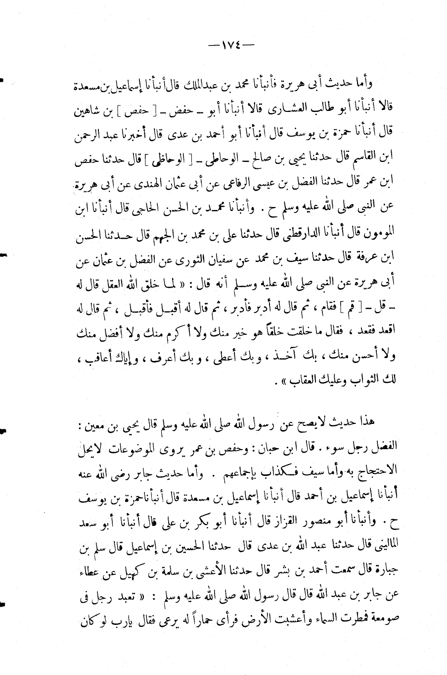 قَالا أَنْبَأَنَا أَبُو طَالِبٍ الْعُشَارِيُّ قَالَا أَنبأَنَا أَبُو حفض [حَفْصِ] بْنُ شَاهِينَ قَالَ أَنْبَأَنَا حَمْزَةُ بْنُ يُوسُفَ قَالَ أَنْبَأَنَا أَبُو أَحْمد بن عدي قَالَ أخبرنَا عبد الرحمن ابْن الْقَاسِم قَالَ حَدثنَا يحى بن صَالح الوحاطى [الوحاظى] قَالَ حَدثنَا حَفْص ابْن عُمَرَ قَالَ حَدَّثَنَا الْفَضْلُ بْنُ عِيسَى الرِّفَاعِيُّ عَنْ أَبِي عُثْمَانَ الْهِنْدِيُّ عَنْ أَبِي هُرَيْرَةَ عَنِ النَّبِي صَلَّى اللَّهُ عَلَيْهِ وَسَلَّمَ ح.