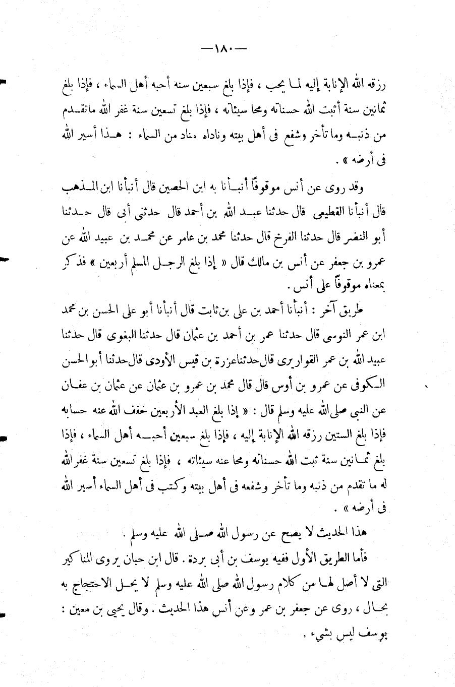 طَرِيقٌ آخَرُ: أَنْبَأَنَا أَحْمَدُ بْنُ عَلِيِّ بن ثَابت قَالَ أَنبأَنَا أَبُو على الْحسن بن مُحَمَّد ابْن عُمَرَ النَّوْسِيُّ قَالَ حَدَّثَنَا عُمَرُ بْنُ أَحْمَدَ بْنِ عُثْمَانَ قَالَ حَدثنَا الْبَغَوِيّ قَالَ حَدثنَا عبيد الله بْنُ عُمَرَ الْقَوَارِيرِيُّ قَالَ حَدَّثَنَا عِزْرَةُ بْنُ قَيْسٍ الأَوْدِيُّ قَالَ حَدَّثَنَا أَبُو الْحَسَنِ الْكُوفِيُّ عَنْ عَمْرِو بْنِ أَوْسٍ قَالَ قَالَ مُحَمَّدُ بْنُ عَمْرِو بْنِ عُثْمَانَ عَنْ عُثْمَانَ بْنِ عَفَّانَ عَنِ النَّبِي صَلَّى اللَّهُ عَلَيْهِ وَسَلَّمَ قَالَ: " إِذَا بَلَغَ الْعَبْدُ الأَرْبَعِينَ خَفَّفَ اللَّهُ عَنْهُ حِسَابَهُ فَإِذَا بَلَغَ السِّتِّينَ رَزَقَهُ اللَّهُ الإِنَابَةَ إِلَيْهِ، فَإِذَا بَلَغَ سَبْعِينَ أَحَبَّهُ أَهْلُ السَّمَاءِ، فَإِذَا بَلَغَ ثَمَانِينَ سَنَةً ثَبَّتَ اللَّهُ حَسَنَاتِهِ وَمَحَا عَنْهُ سَيِّئَاتِهِ، فَإِذَا بَلَغَ تِسْعِينَ سَنَةً غَفَرَ اللَّهُ لَهُ مَا تَقَدَّمَ مِنْ ذَنْبِهِ وَمَا تَأَخَّرَ وَشَفَّعَهُ فِي أَهْلِ بَيْتِهِ وَكُتِبَ فِي أَهْلِ السَّمَاءِ أَسِيرُ اللَّهِ فِي أَرْضِهِ ".