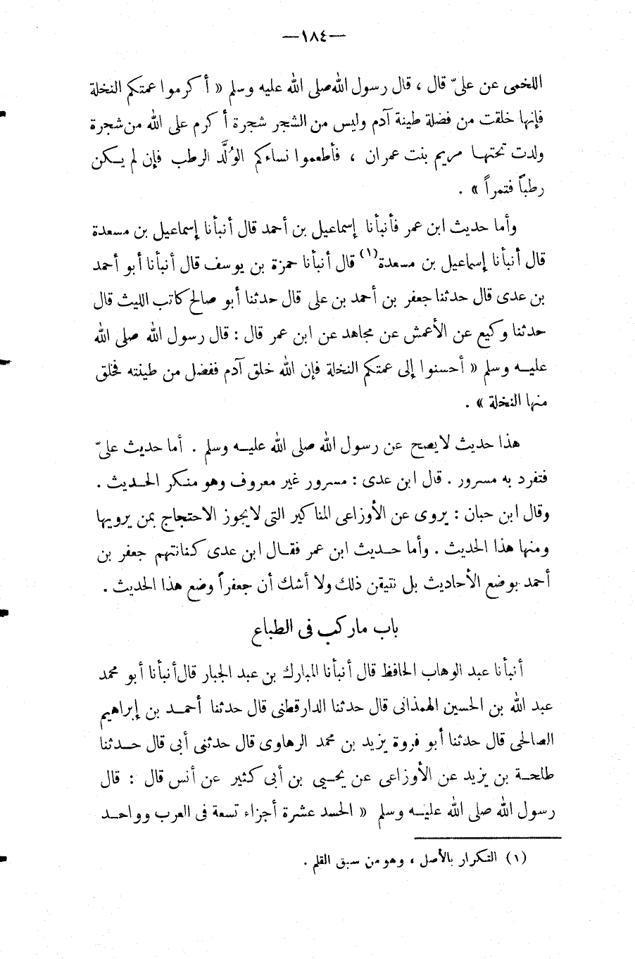 وَأَمَّا حَدِيثُ ابْنُ عُمَرَ فَأَنْبَأَنَا إِسْمَاعِيلُ بْنُ أَحْمَدَ قَالَ أَنْبَأَنَا إِسْمَاعِيلُ بْنُ مَسْعَدَةَ قَالَ أَنْبَأَنَا إِسْمَاعِيلُ بْنُ مَسْعَدَةَ (1) قَالَ أَنْبَأَنَا حَمْزَةُ بْنُ يُوسُفَ قَالَ أَنْبَأَنَا أَبُو أَحْمَدَ بْنُ عَدِيٍّ قَالَ حَدَّثَنَا جَعْفَرُ بْنُ أَحْمَدَ بْنِ عَلِيٍّ قَالَ حَدَّثَنَا أَبُو صَالِحٍ كَاتِبُ اللَّيْثِ قَالَ حَدَّثَنَا وَكِيعٌ عَنِ الأَعْمَشِ عَنْ مُجَاهِدٍ عَنِ ابْنِ عُمَرَ قَالَ: قَالَ رَسُول الله صَلَّى اللَّهُ عَلَيْهِ وَسَلَّمَ " أَحْسِنُوا إِلَى عَمَّتِكُمُ النَّخْلَةِ فَإِنَّ اللَّهَ خَلَقَ آدَمَ فَفَضَّلَ مِنْ طِينَتِهِ فَخَلَقَ مِنْهَا النَّخْلَةَ ".