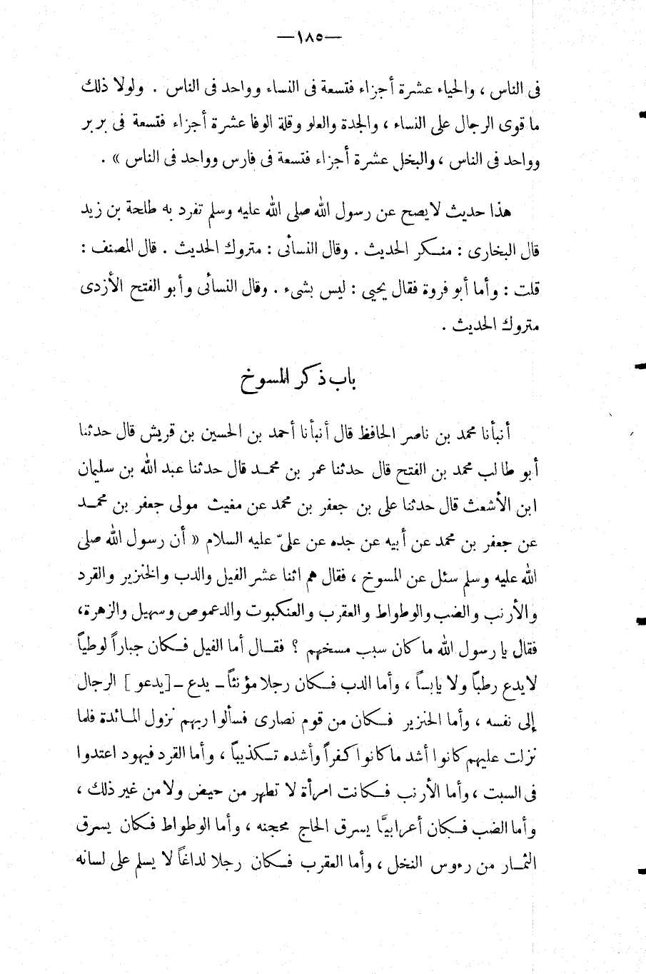 بَاب ذكر المسوخ أَنبأَنَا مُحَمَّد بن نَاصِر الْحَافِظ قَالَ أَنْبَأَنَا أَحْمَدُ بْنُ الْحُسَيْنِ بْنِ قُرَيْشٍ قَالَ حَدَّثَنَا أَبُو طَالِبٍ مُحَمَّدُ بْنُ الْفَتْحِ قَالَ حَدَّثَنَا عُمَرُ بْنُ مُحَمَّدٍ قَالَ حَدثنَا عبد الله بن سُلَيْمَان ابْن الأَشْعَثِ قَالَ حَدَّثَنَا عَلِيُّ بْنُ جَعْفَرِ بْنِ مُحَمَّدٍ عَنْ مُغَيِّثٍ مَوْلَى جَعْفَرِ بْنِ مُحَمَّدٍ عَنْ جَعْفَرِ بْنِ مُحَمَّدٍ عَنْ أَبِيهِ عَنْ جَدِّهِ عَنْ عَلِيٍّ عَلَيْهِ السَّلامُ " أَنَّ رَسُولَ اللَّهِ صَلَّى اللَّهُ عَلَيْهِ وَسَلَّمَ سُئِلَ عَنِ الْمُسُوخِ، فَقَالَ هُمُ اثْنَا عَشْرَ الْفِيلُ وَالدُّبُّ وَالْخِنْزِيرُ وَالْقِرْدُ وَالأَرْنَبُ والضب والوطواط وَالْعَقْرَب وَالْعَنْكَبُوت وَالِد عموص وَسُهَيْلٌ وَالزُّهْرَةُ، فَقَالَ يَا رَسُولَ اللَّهِ مَا كَانَ سَبَبُ مَسْخِهِمْ؟ فَقَالَ أَمَّا الْفِيلُ فَكَانَ جَبَّارًا لَوَّطِيًّا
