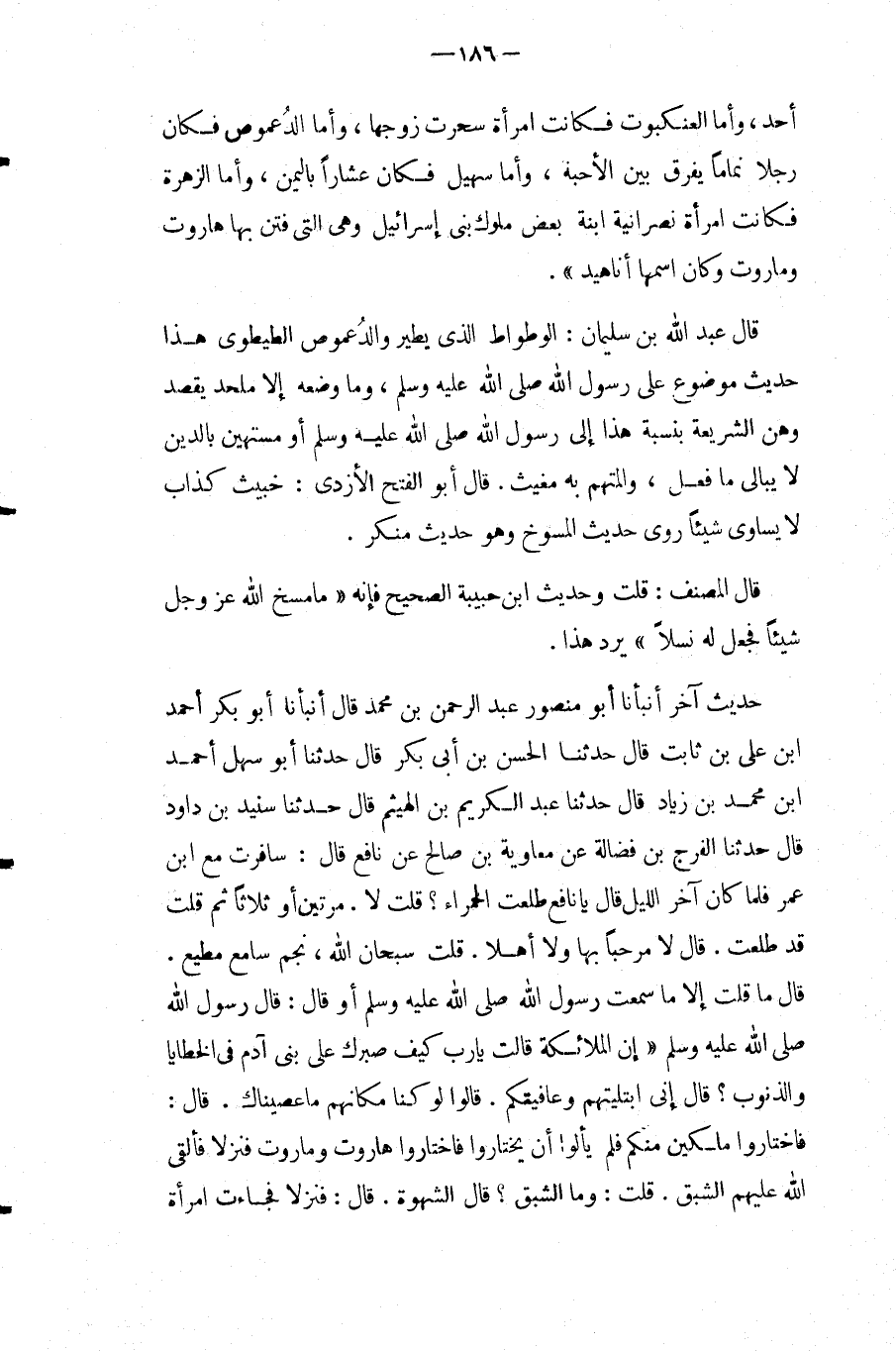 قَالَ عبد الله بْنُ سُلَيْمَانَ: الْوَطْوَاطُ الَّذِي يَطِيرُ والدُّعْمُوصُ الطِّيطَوَى هَذَا حَدِيثٌ مَوْضُوعٌ على رَسُول الله صَلَّى اللَّهُ عَلَيْهِ وَسَلَّمَ، وَمَا وَضَعَهُ إِلا مُلْحِدٌ يَقْصِدُ وَهْنَ الشَّرِيعَةِ بِنِسْبَةِ هَذَا إِلَى رَسُولِ اللَّهِ صَلَّى اللَّهُ عَلَيْهِ وَسَلَّمَ أَوْ مُسْتَهِينٌ بِالدِّينِ لَا يُبَالِي مَا فَعَلَ، وَالْمُتَّهَمُ بِهِ مُغِيثٌ.