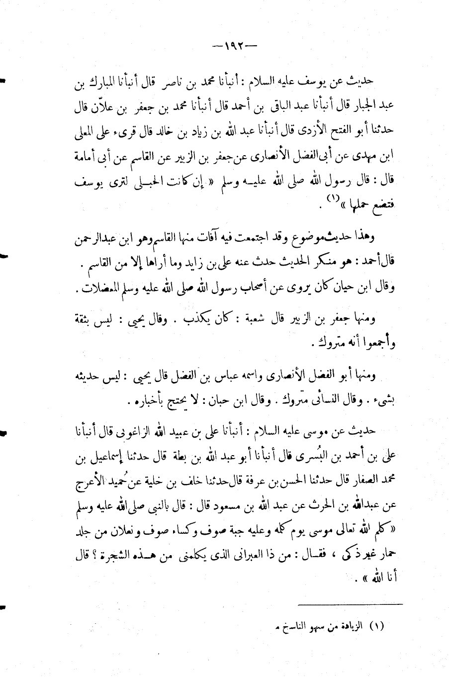 حَدِيث عَن يُوسُف عَلَيْهِ السَّلَام: أَنْبَأَنَا مُحَمَّدُ بْنُ نَاصِرٍ قَالَ أَنْبَأَنَا الْمُبَارَكُ بْنُ عَبْدِ الْجَبَّارِ قَالَ أَنْبَأَنَا عَبْدُ الْبَاقِي بْنُ أَحْمَدَ قَالَ أَنبأَنَا مُحَمَّد بن جَعْفَر بْنِ عَلانَ قَالَ حَدَّثَنَا أَبُو الْفَتْح الازدي قَالَ أَنبأَنَا عبد الله بْنُ زِيَادِ بْنِ خَالِدٍ قَالَ قرئَ على الْمُعَلَّى ابْن مَهْدِيٍّ عَنْ أَبِي الْفَضْلِ الأَنْصَارِيِّ عَنْ جَعْفَرِ بْنِ الزُّبَيْرِ عَنِ الْقَاسِمِ عَنْ أَبِي أُمَامَةَ قَالَ: قَالَ رَسُول الله صَلَّى اللَّهُ عَلَيْهِ وَسَلَّمَ " إِنْ كَانَتِ الْحُبْلَى لَتَرَى يُوسُفَ فَتَضَعُ حَمْلَهَا " (1) .